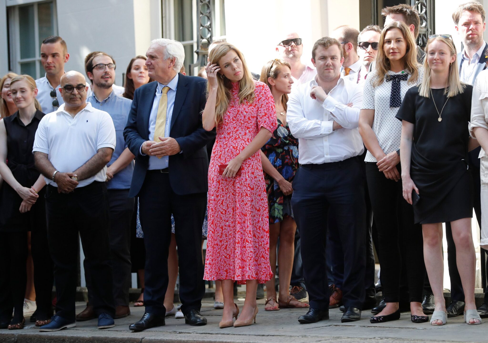 H σύντροφος του Μπόρις Τζόνσον, Κάρι Σάιμοντς, ανυπόμονη λίγο πριν την άφιξη του νέου πρωθυπυοργού.  ASSOCIATED PRESS