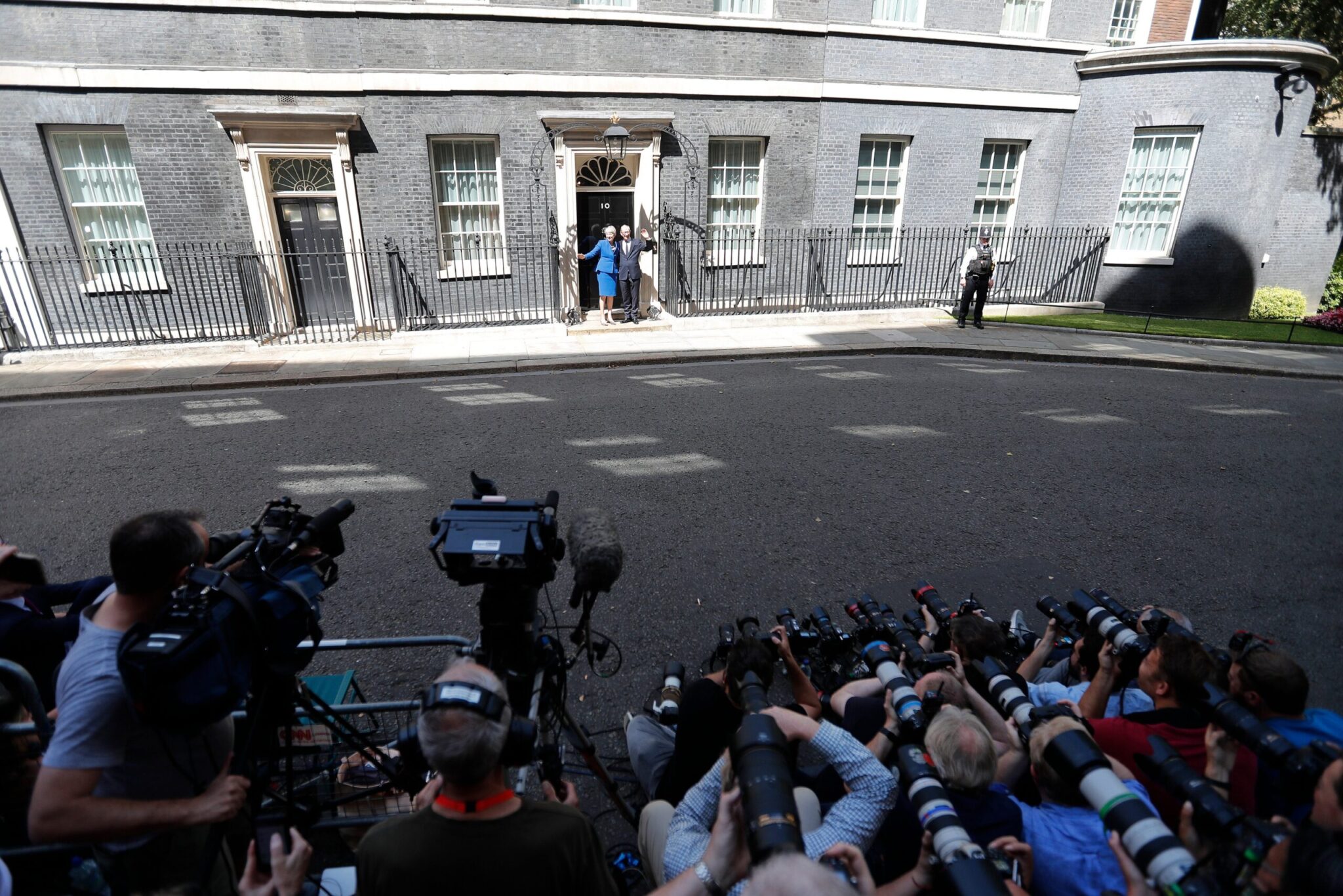 Οι κάμερες στήνονται για να απαθανατίσουν την τελευταία έξοδο της Τερέζα Μέι από την Ντάουνινγκ Στριτ.  ASSOCIATED PRESS