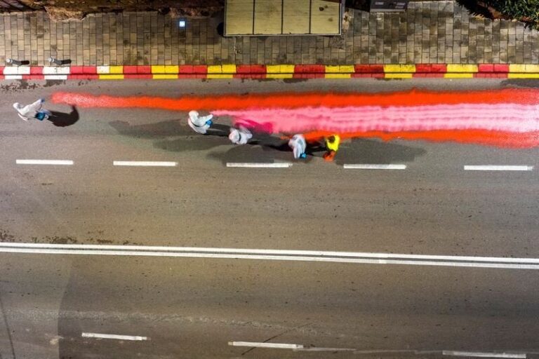 Πλάνα από drone έδειξαν μια μικρή ομάδα ανθρώπων με προστατευτικές στολές να ψεκάζουν μια φαρδιά κόκκινη λωρίδα κατά μήκος κυρίως ερημικών δρόμων που οδηγούν από το συγκρότημα της αστυνομίας μέχρι το Ανώτατο Δικαστήριο στην κεντρική Ιερουσαλήμ.