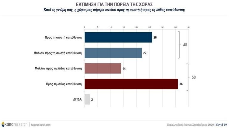 Ως προς το γενικότερο κλίμα για την πορεία της χώρας, το 48% των πολιτών θεωρούν πως η χώρα κινείται πως τη σωστή κατεύθυνση (26% σίγουρα, 22% μάλλον), και 50% προς τη λάθος (14% μάλλον, 36% σίγουρα).