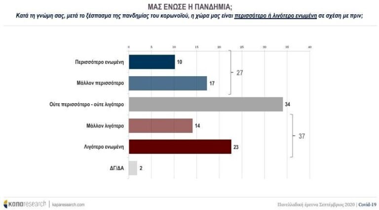 Όσον αφορά στο αν η χώρα είναι περισσότερο ή λιγότερο ενωμένη μετά το ξέσπασμα της πανδημίας του κορονοϊού, το 27% των ερωτηθέντων λένε περισσότερο (10% περισσότερο, 17% μάλλον περισσότερο), το 34% απαντούν ούτε περισσότερο ούτε λιγότερο, και το 37% απαντούν λιγότερο ενωμένη (λιγότερο ενωμένη 23%, μάλλον λιγότερο ενωμένη το 14%).