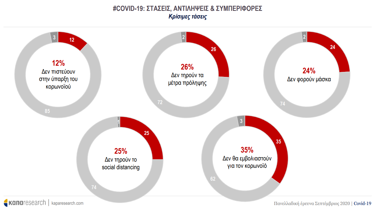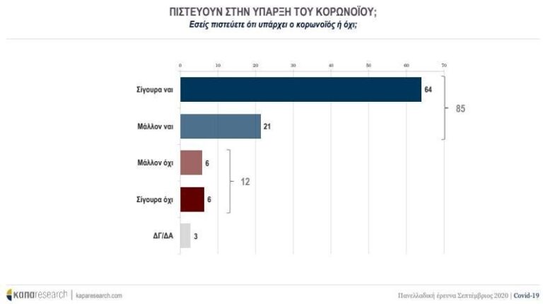 Όσον αφορά στο αν πιστεύουν στην ύπαρξη του κορονοϊού ή όχι, το 85% απαντούν θετικά (64% σίγουρα ναι, 21% μάλλον ναι). Αρνητικά απαντά το 12% (6% σίγουρα όχι, 6% μάλλον όχι).