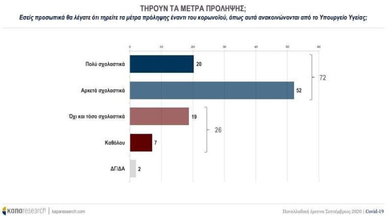 Ενδιαφέρον παρουσιάζουν τα δύο ερωτήματα σχετικά με την τήρηση των μέτρων: Στο ερώτημα «εσείς προσωπικά θα λέγατε ότι τηρείτε τα μέτρα πρόληψης έναντι του κορονοϊού, όπως αυτά ανακοινώνονται από το υπουργείο Υγείας», το 72% απαντά θετικά (20% πολύ σχολαστικά, 52% αρκετά σχολαστικά), και το 26% αρνητικά (19% όχι και τόσο σχολαστικά, 7% καθόλου).