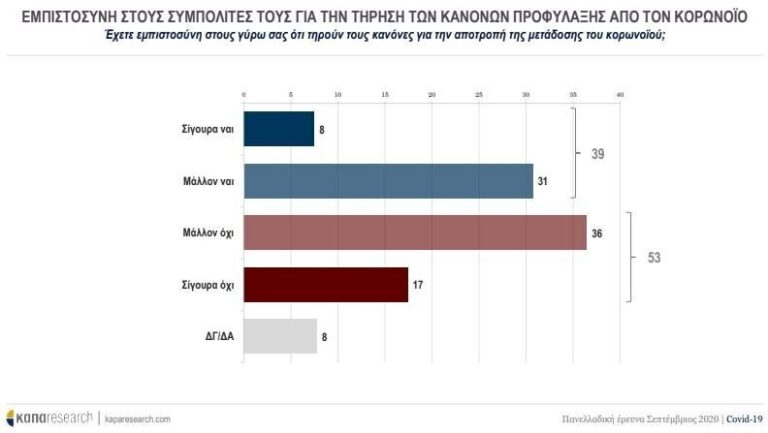 Το επόμενο ερώτημα είναι αν «έχετε εμπιστοσύνη στους γύρω σας ότι τηρούν τους κανόνες για την αποτροπή της μετάδοσης του κορονοϊού». Το 39% απαντά θετικά (σίγουρα ναι το 8%, μάλλον ναι το 31%), και το 53% αρνητικά (36% μάλλον όχι, 17% σίγουρα όχι).