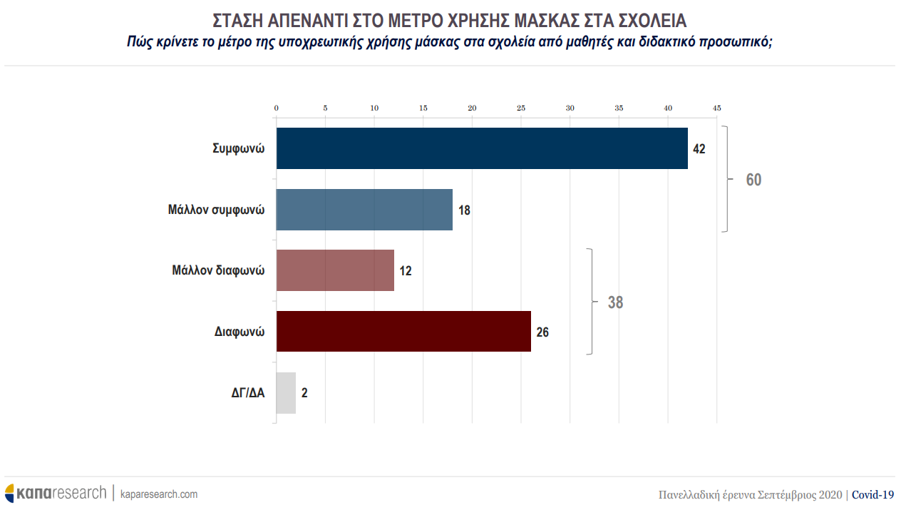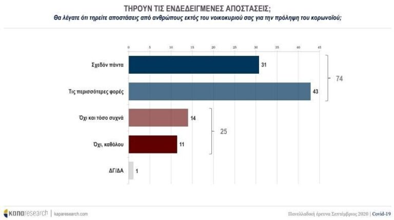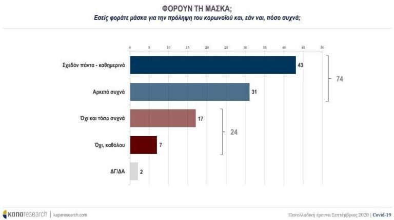 Σχετικά με τη χρήση μάσκας, το 74% απαντά θετικά (43% σχεδόν πάντα- καθημερινά, 31% αρκετά συχνά) και το 24% αρνητικά (17% όχι και τόσο συχνά, 7% όχι καθόλου).