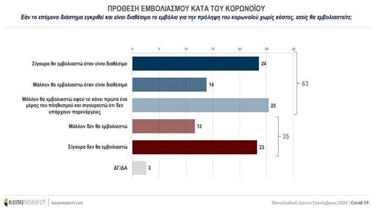 Ως προς την πρόθεση εμβολιασμού, θετικό είναι το 63% και αρνητικό το 35%. Ωστόσο, ακόμα και στα θετικά, υπάρχει ένα σημαντκό ποσοστό (25%) που λέει ότι μάλλον θα εμβολιαστεί αφού όμως το κάνει πρώτα ένα μέρος του πληθυσμού και σιγουρευτεί ότι δεν υπάρχουν παρενέργειες.