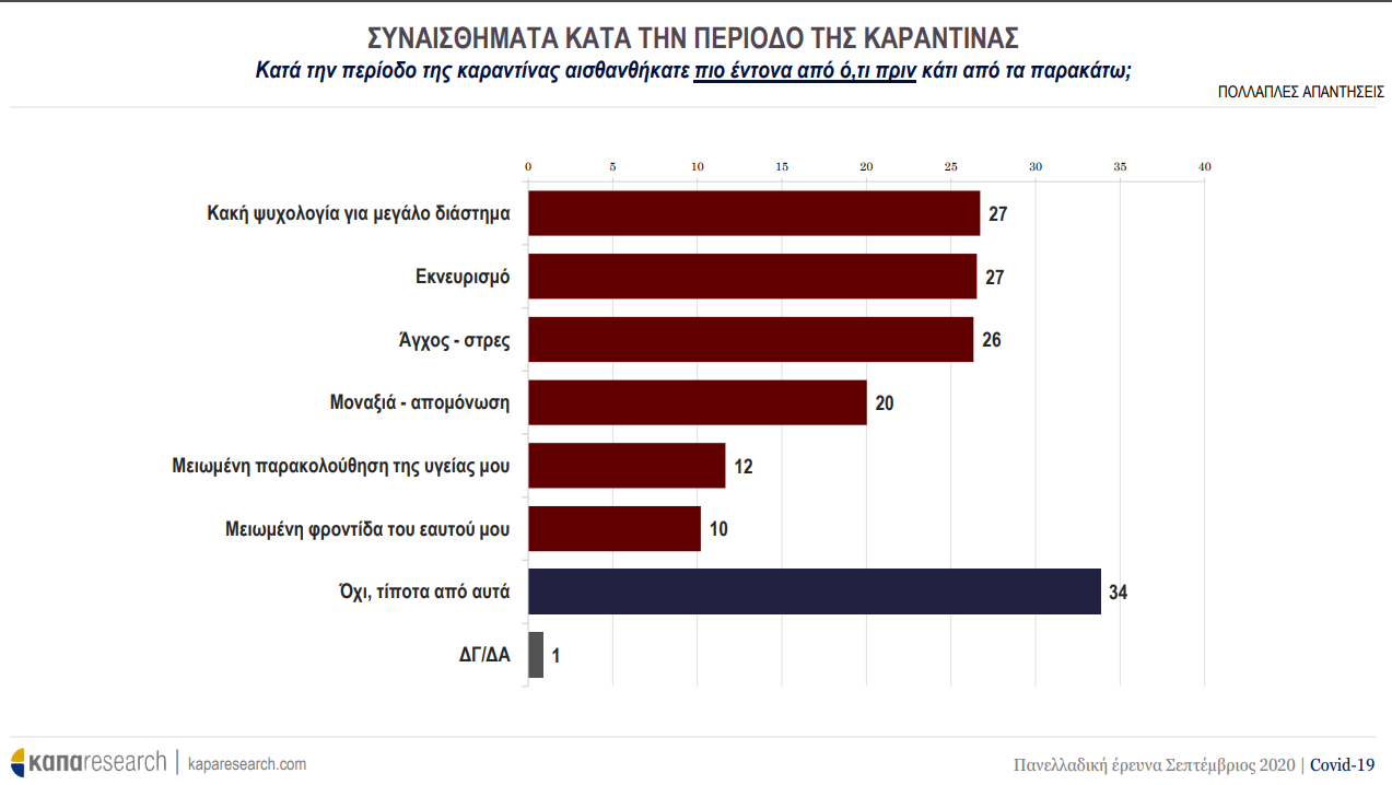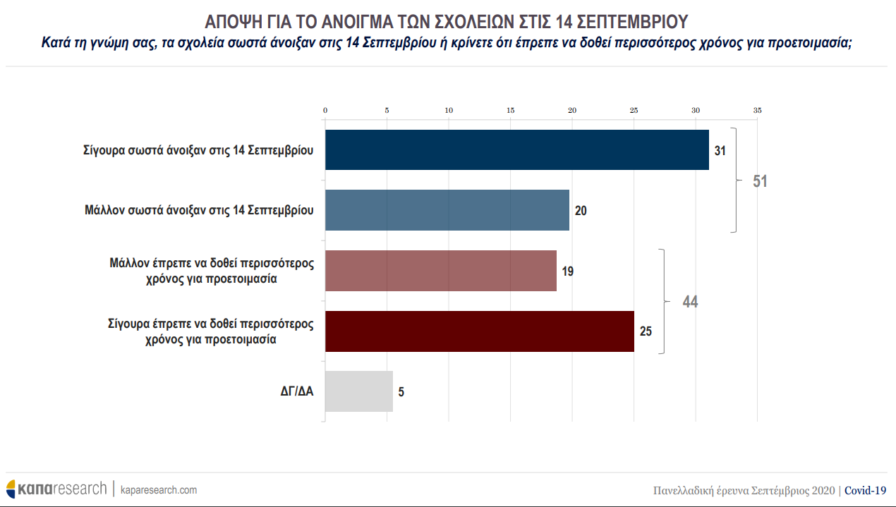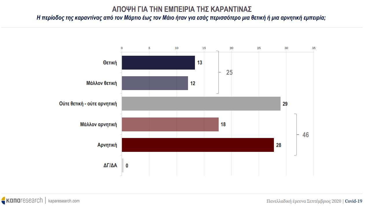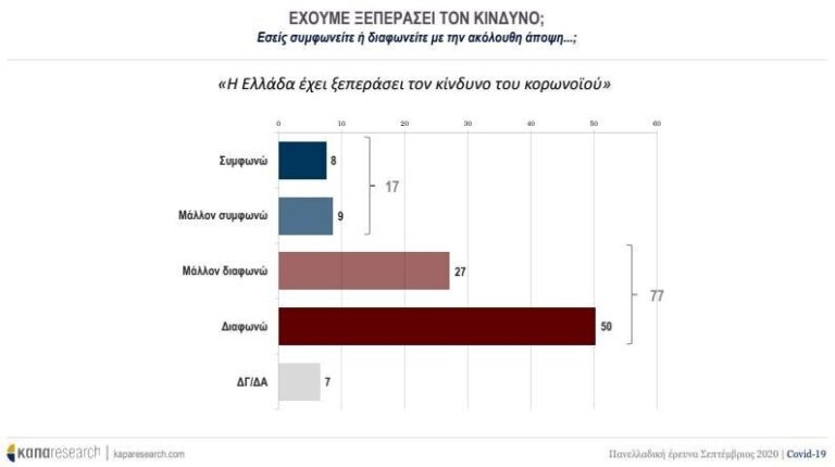 Ερωτηθέντες εάν συμφωνούν ή διαφωνούν με τη φράση «Η Ελλάδα έχει ξεπεράσει τον κίνδυνο του κορονοϊού», το 17% συμφωνούν (8% συμφωνούν, 9% μάλλον συμφωνούν), και 77% διαφωνούν (27% μάλλον διαφωνούν, 50% διαφωνούν).