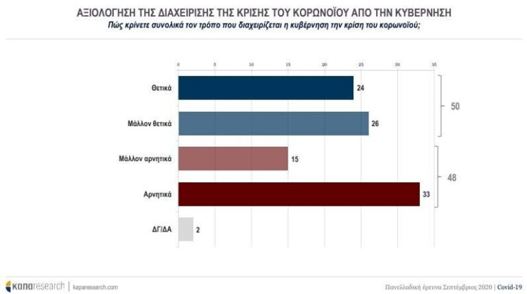 Ως προς το πώς αξιολογούν τη διαχείριση από την κυβέρνηση, θετικά απαντά το 50% και αρνητικά το 48%.
