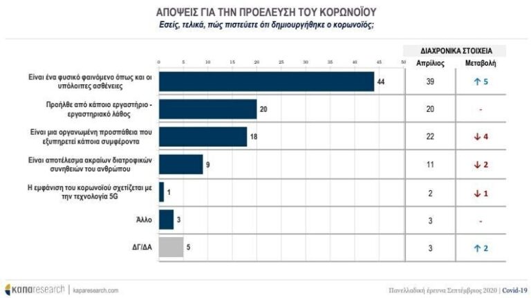 Ωστόσο, δεν είναι λίγοι αυτοί που πιστεύουν για την προέλευση του ιού είτε ότι είναι εργαστηριακό λάθος (20%), ή ότι πρόκειται για μια οργανωμένη προσπάθεια που εξυπηρετεί κάποια συμφέροντα (18%) ή ακόμα και ότι σχετίζεται με την τεχνολογία 5G (1%).