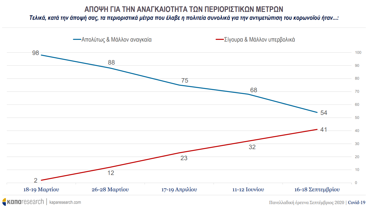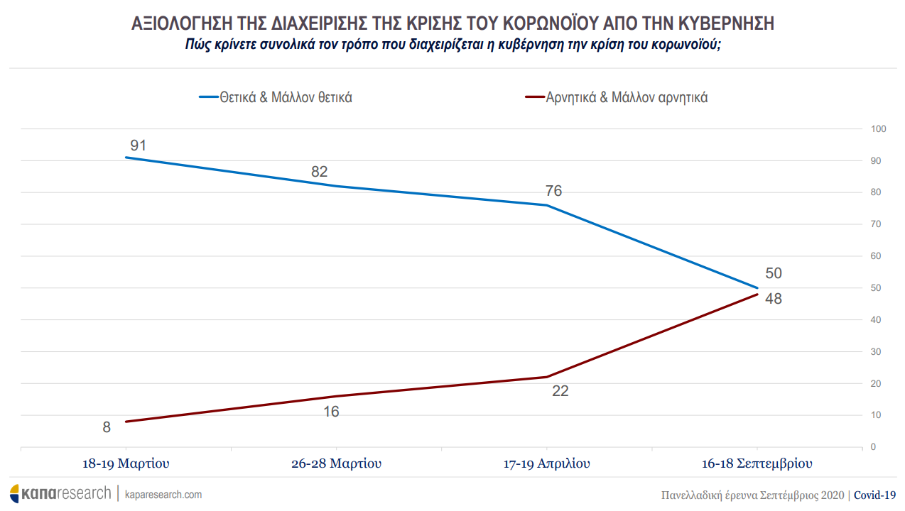 Ενδιαφέρον παρουσιάζει το διάγραμμα με τη σύγκριση για την αξιολόγηση των χειρισμών της κυβέρνησης για τον κορονοϊός από τον Μάρτιο μέχρι σήμερα. Τον Μάρτιο, 9 στους 10 αξιολογούσε θετικά τους χειρισμούς της κυβέρνησης, ενώ τώρα μειώθηκε στο 50%.