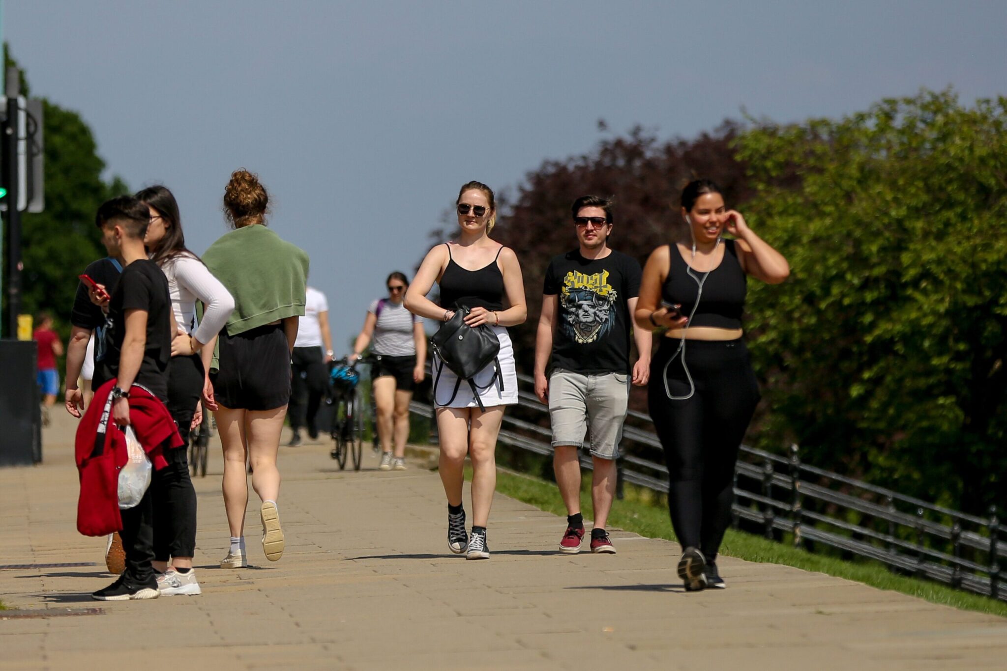 Λονδίνο, 8 Μαϊου 2020. Νέοι άνθρωποι περπατούν απολαμβάνοντας ένα ηλιόλουστο και ζεστό απόγευμα, έστω και εν μέσω πανδημίας…Τις επόμενες ώρες ο πρωθυπουργός της Βρετανίας Μπόρις Τζόνσον αναμένεται να ανακοινώσει την σταδιακή αποκλιμάκωση της απαγόρευσης κυκλοφορίας. (Photo by Dinendra Haria/SOPA Images/LightRocket via Getty Images) SOPA Images via Getty Images