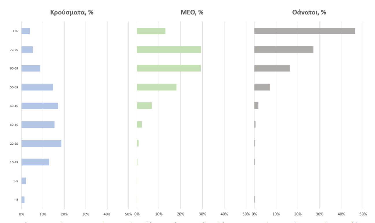 Ηλικιακή κατανομή κρουσμάτων, νοσηλευόμενων στις MEΘ και ασθενών που απεβίωσαν από την αρχή της πανδημίας