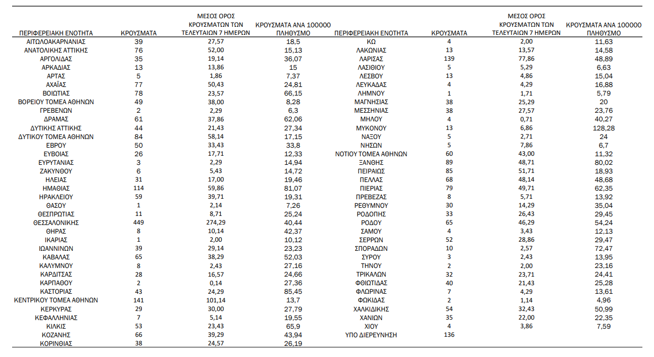 Τα νέα εργαστηριακά επιβεβαιωμένα κρούσματα της νόσου που καταγράφηκαν τις τελευταίες 24 ώρες είναι 3.040, εκ των οποίων 8 εντοπίστηκαν κατόπιν ελέγχων στις πύλες εισόδου της χώρας. Ο συνολικός αριθμός των κρουσμάτων ανέρχεται σε 636.596 (ημερήσια μεταβολή +0.6%), εκ των οποίων 51.0% άνδρες. Με βάση τα επιβεβαιωμένα κρούσματα των τελευταίων 7 ημερών, 134 θεωρούνται σχετιζόμενα με ταξίδι από το εξωτερικό και 3.178 είναι σχετιζόμενα με ήδη γνωστό κρούσμα.
