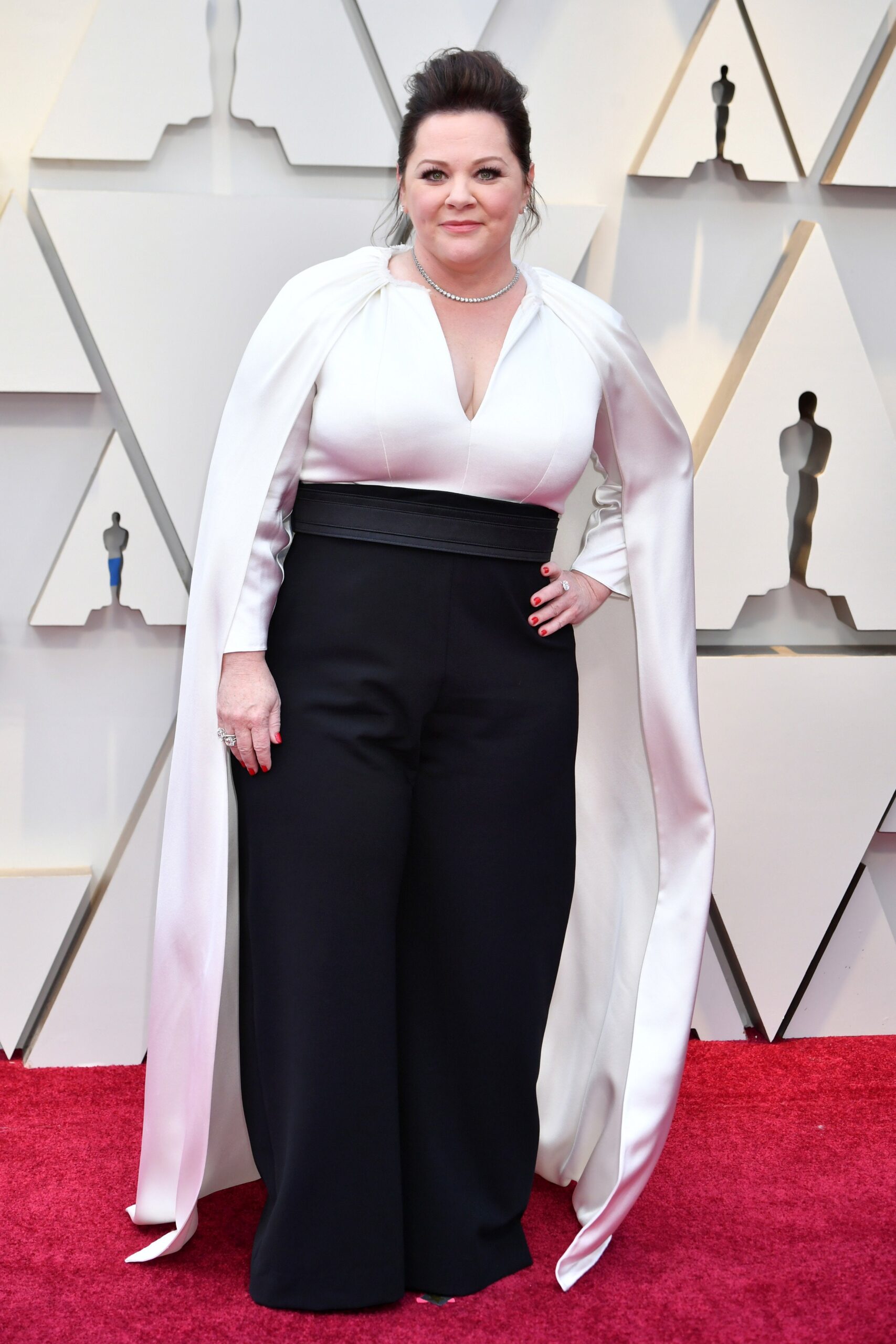 01.20 Η υποψήφια για Οσκαρ Α′ Γυναικείου Μελίσα Μακάρθι, με μαύρη, ψιλόμεση παντελόνα και λευκή μπλούζα με ενσωματωμένη κάπα από σατέν.