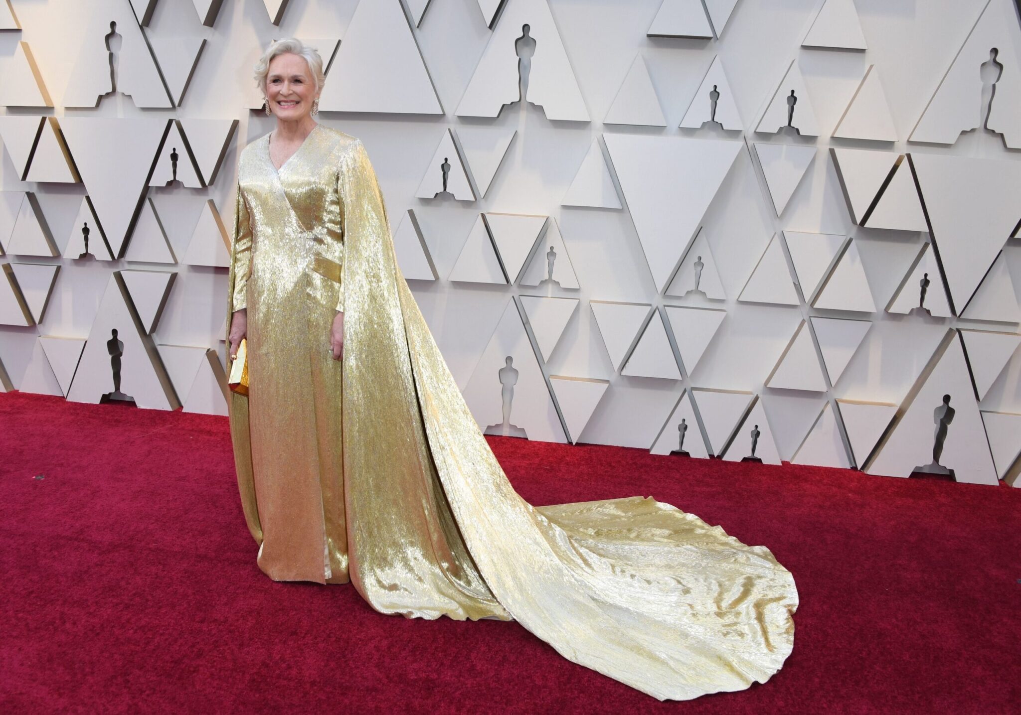 01.34 Η υποψήφια για Οσκαρ Α′ Γυναικείου Γκλέν Κλόουζ, με χρυσή (της απόχρωσης του αγαλματιδίου) εντυπωσιακή τουαλέτα με ουρά.