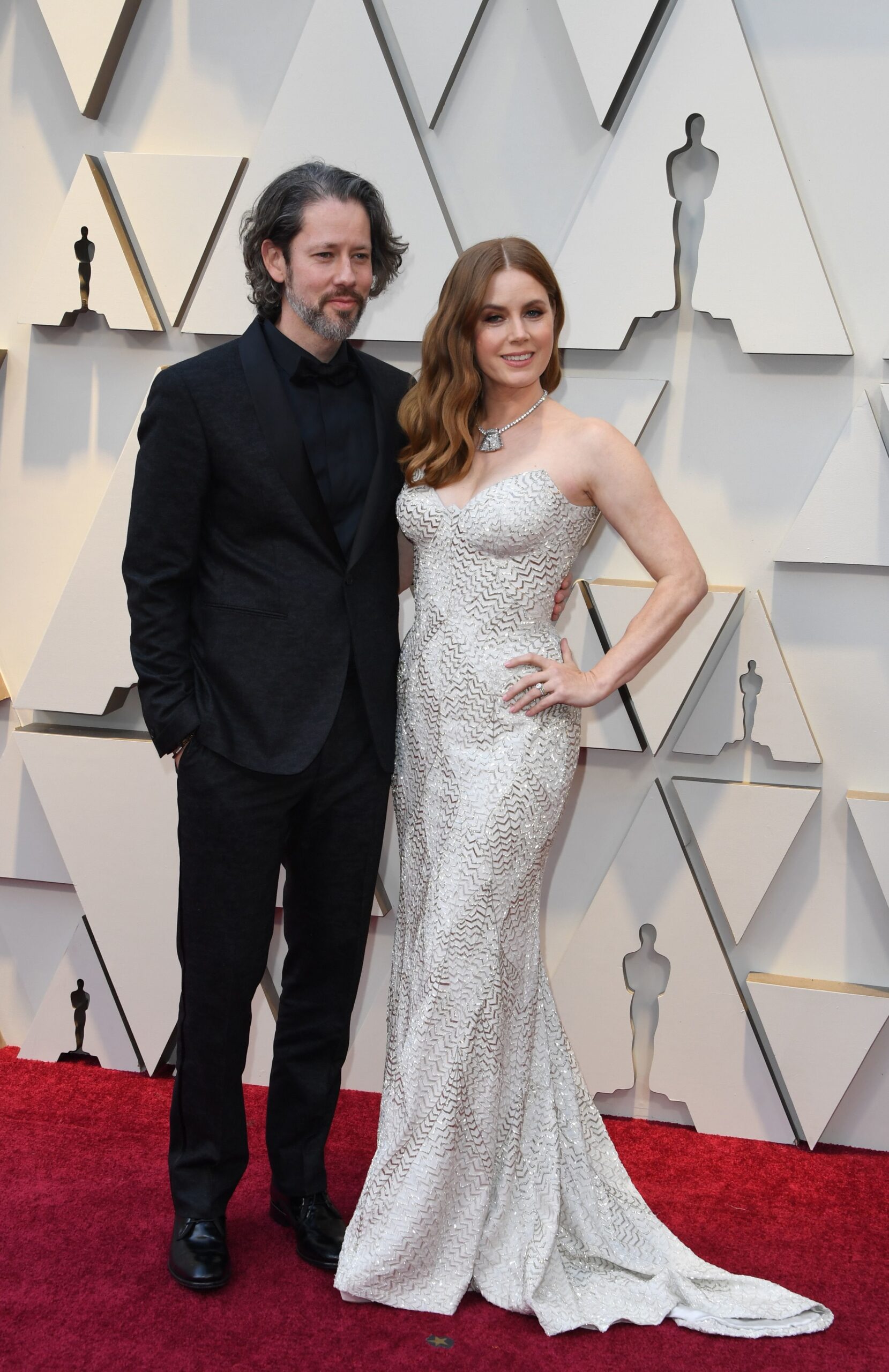 02.25 Η υποψήφια για Οσκαρ Έιμι Άνταμς, με εφαρμοστή τουαλέτα σε λευκό ασημί. Στο πλευρό της ο σύζυγός της, Ντάρεν λε Γκάλο.