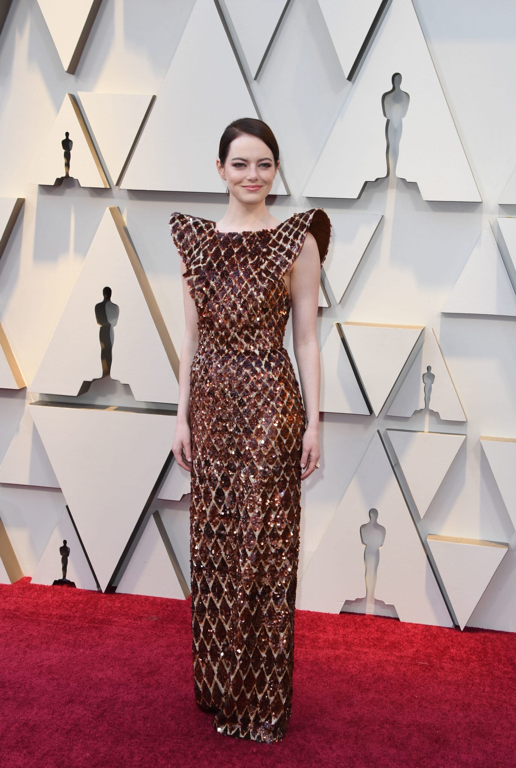 02.20 Η Έμμα Στόουν, υποψήφια για Οσκαρ Β′ Γυναικείου για την ερμηνεία της στο «The Favourite», με φόρεμα σε στενή γραμμή από μελί και χρυσαφί παγέτες.