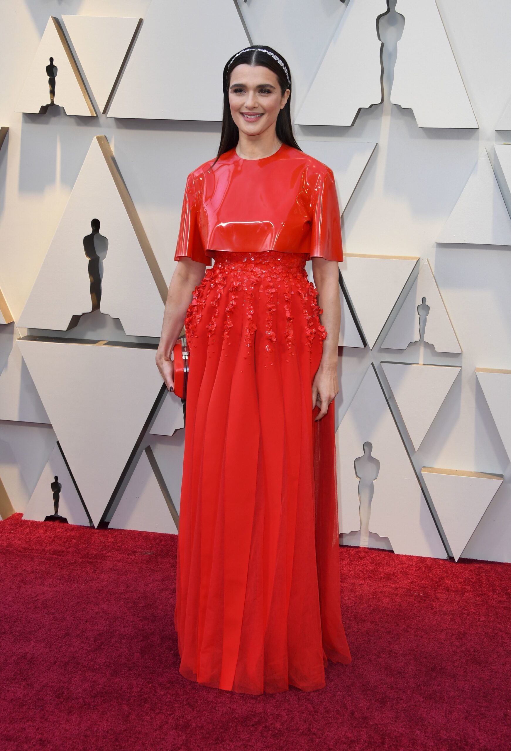 02.25 Η υποψήφια για Οσκαρ Β′ Γυναικείου Ρέιτσελ Βάις φοράει τοπ από βινύλιο και φούστα με ανάγλυφα κεντήματα.