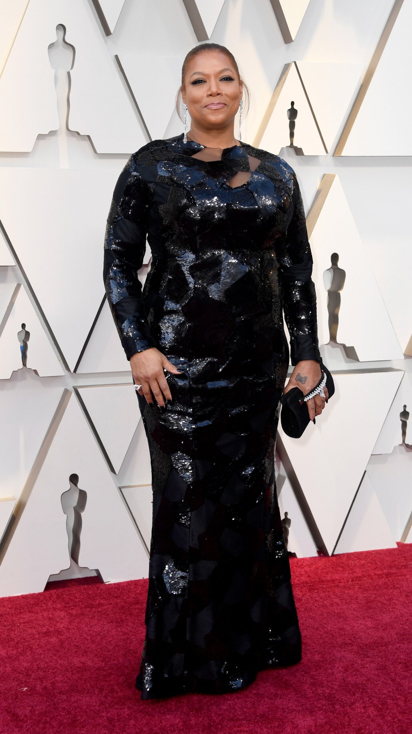 02.42 Η Queen Latifa με ολοκέντητη τουαλέτα από παγέτα στο κόκκινο χαλί.