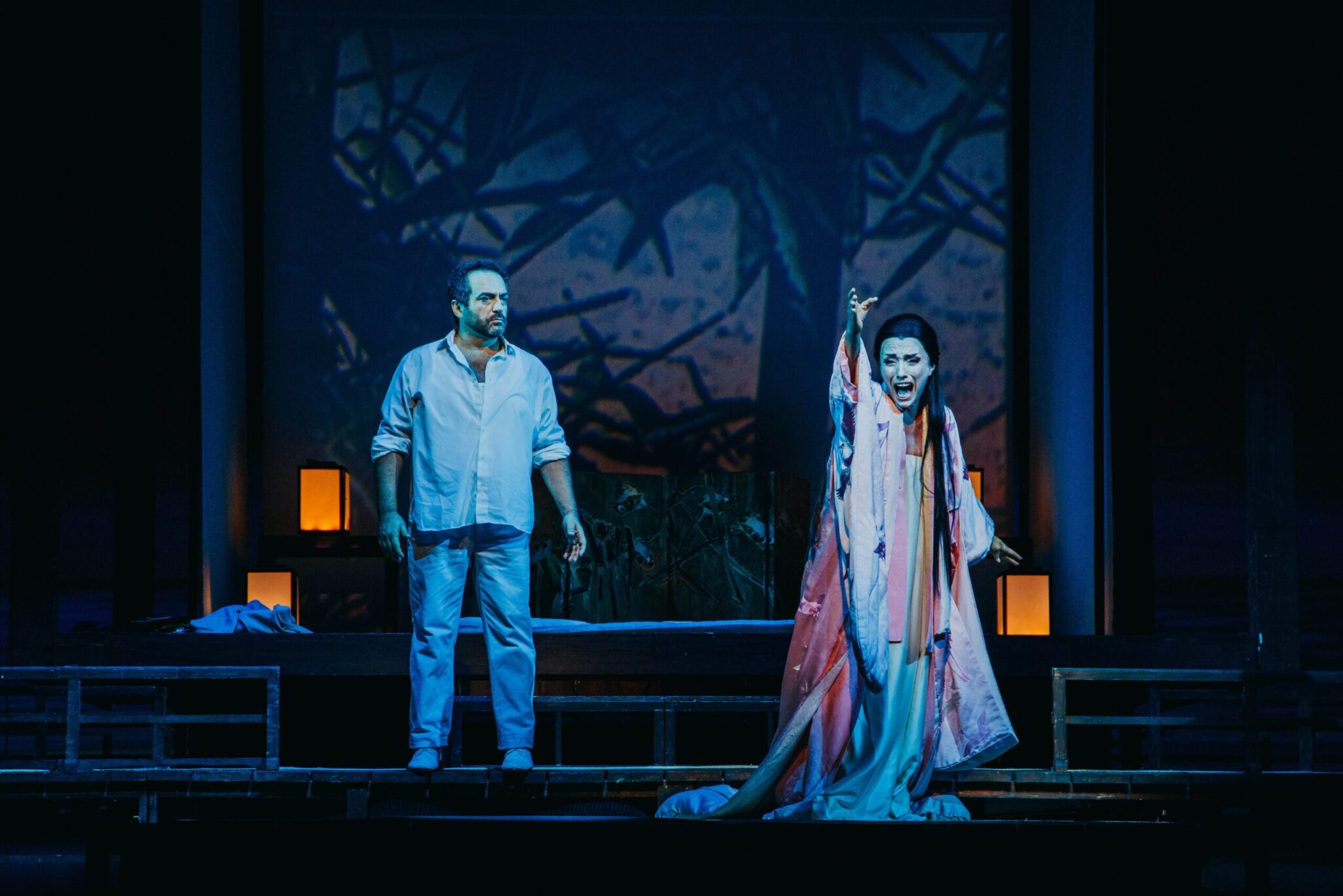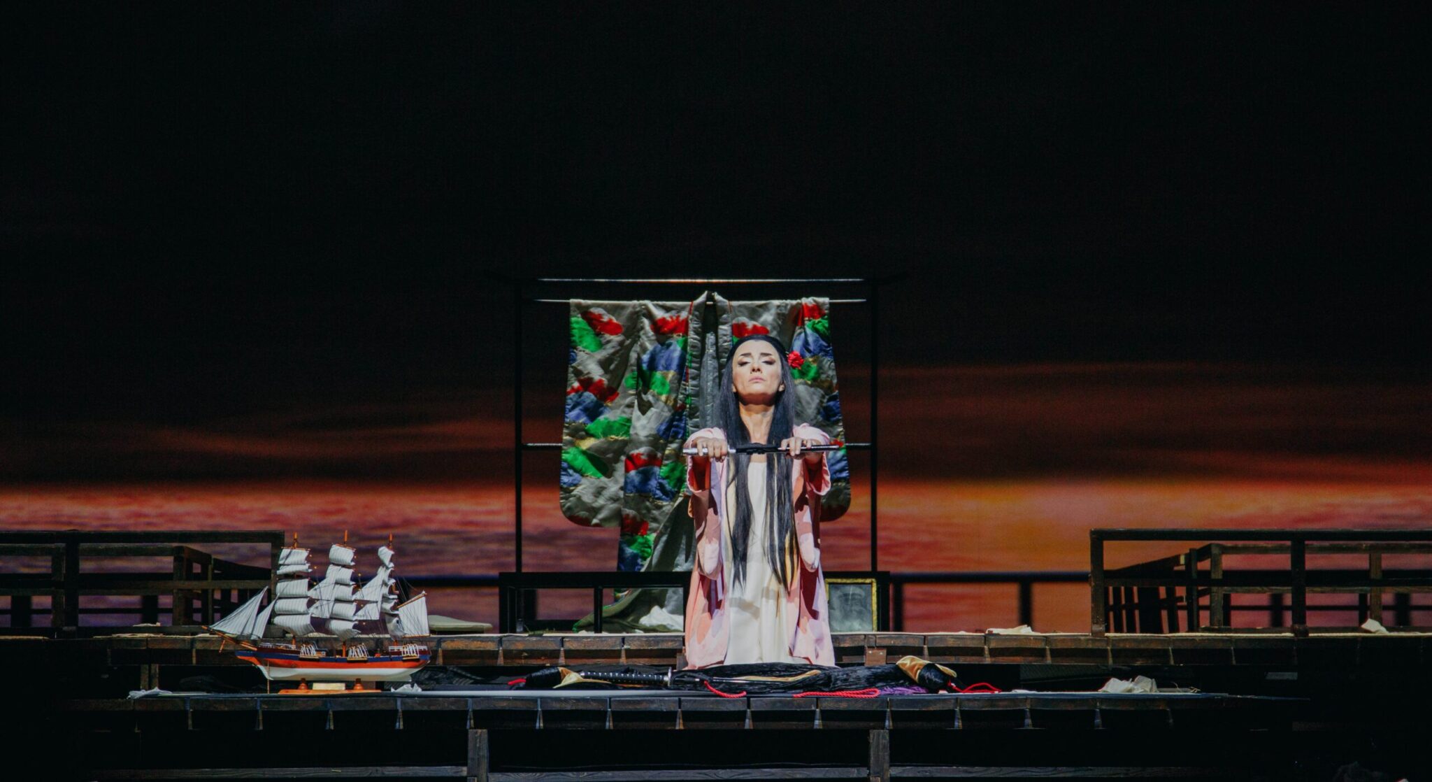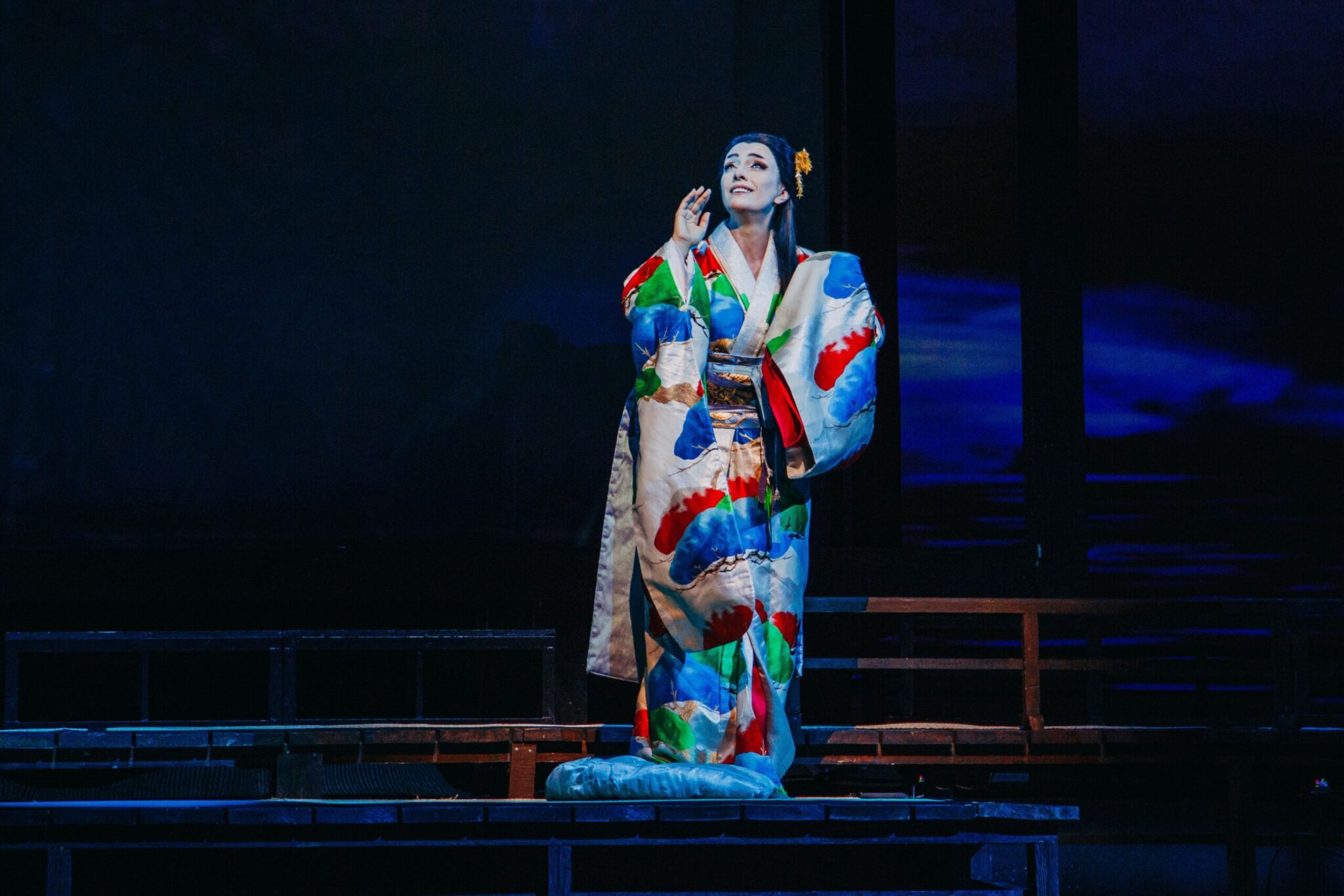 Πρόκειται για μια εντυπωσιακή παραγωγή με παραδοσιακά γιαπωνέζικα κοστούμια, ενώ τα σκηνικά και οι προβολές εικονοποιούν με εντυπωσιακό τρόπο τη χώρα του ανατέλλοντος ηλίου από τη μια και τον ψυχισμό της ηρωίδας από την άλλη. Τις προβολές υπογράφει ο Σέρτζιο Μετάλλι, ενώ τους φωτισμούς ο Βαλέριο Αλφιέρι.