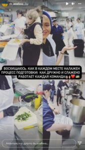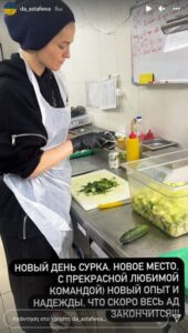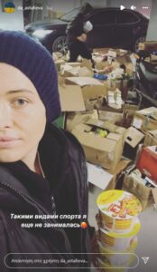 Όπως φαίνεται στις φωτογραφίες που δημοσίευσε στο Instagram, η δουλειά που της έχει ανατεθεί είναι στην τροφοδοσία. Επίσης καθαρίζει πατάτες καθαρίζει πατάτες για να αποσταλούν μαζί με άλλα τρόφιμα και είδη πρώτης ανάγκης στις περιοχές που μαίνονται οι μάχες απέναντι στους Ρώσους εισβολείς.