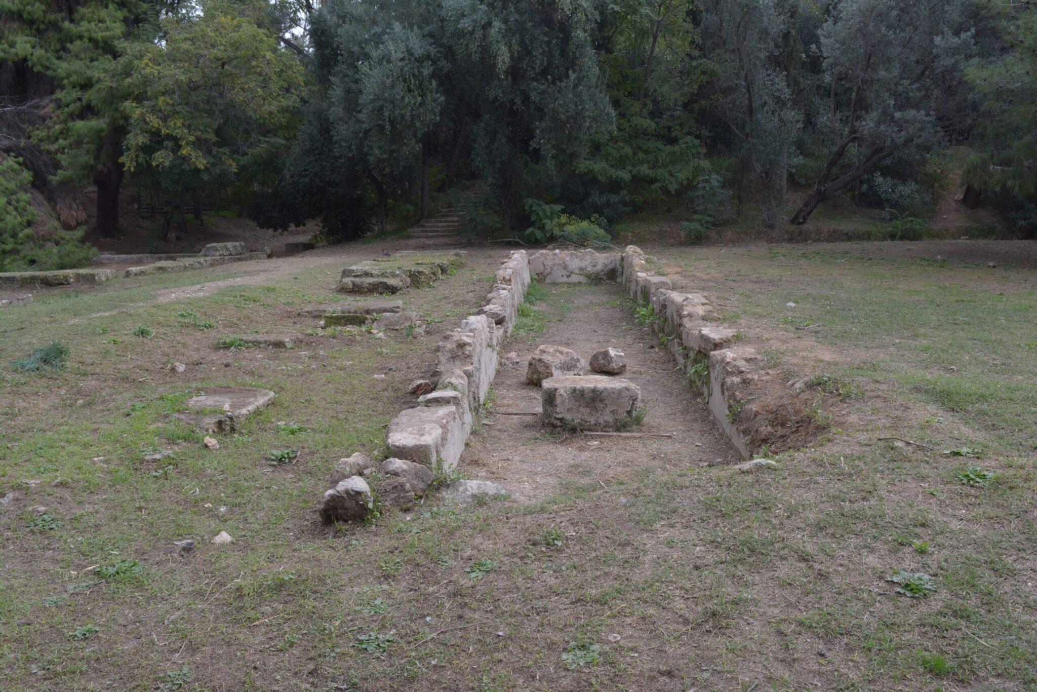 Στο επίπεδο των αρχαίων καταλοίπων προβλέπεται  η ενοποίηση των επιμέρους σκαμμάτων  με αποχωματώσεις,  ανασκαφές, διαμόρφωση νέων πρανών με ήπια κλίση, γήινη μορφή και αποστράγγιση ομβρίων,  καθώς και ταυτόχρονη απομάκρυνση δένδρων, όπου απαιτείται, τα οποία θα μεταφυτευθούν σε άλλα σημεία του πάρκου ή και θα φυτευθούν νέα άτομα, για να μη διασαλευθεί το υφιστάμενο ισοζύγιο πρασίνου στο πάρκο.