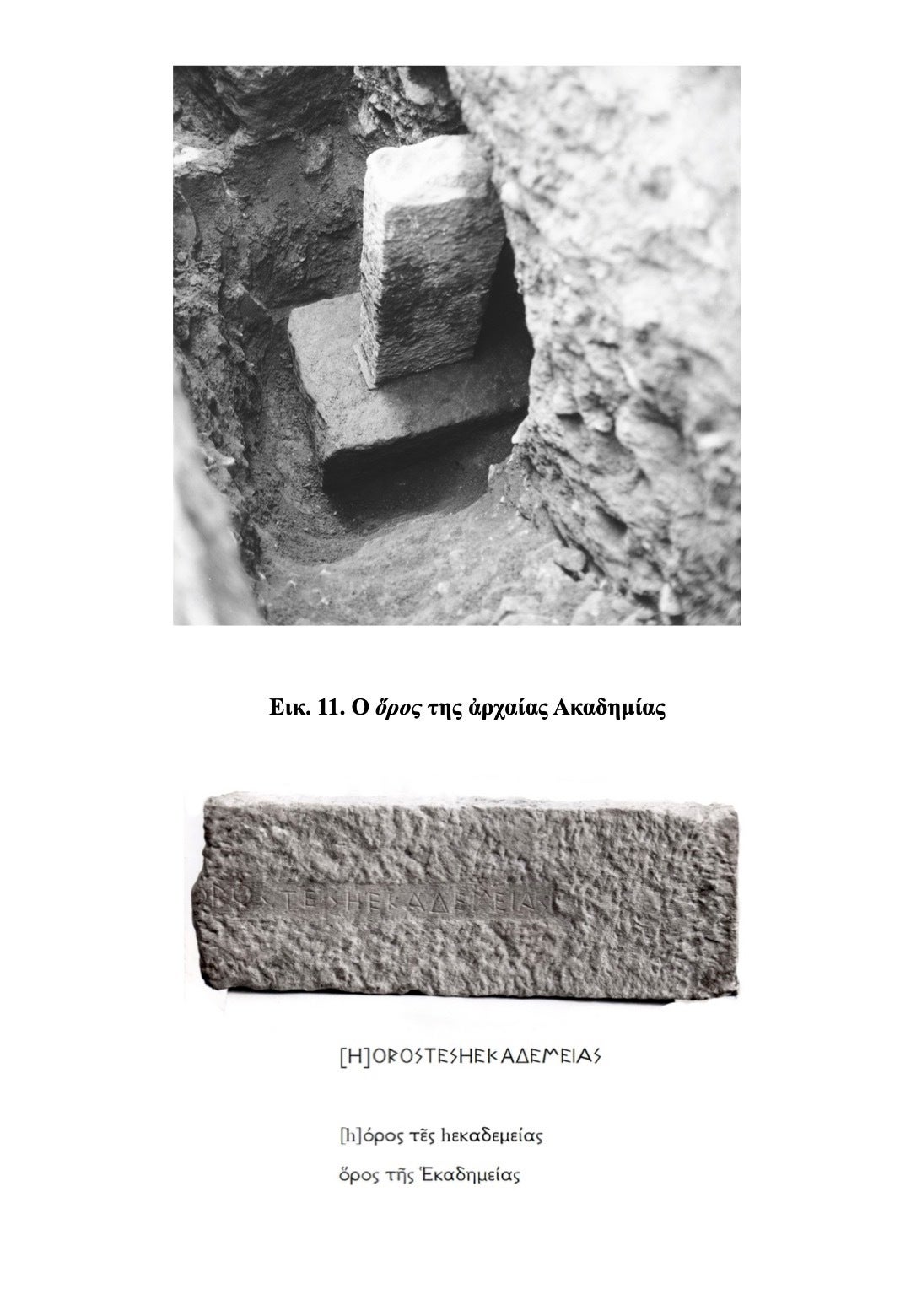 Σημαντικό τοπόσημο στην κυριολεξία αποτελεί η λίθινη στήλη του 500 π.Χ. με την επιγραφή «όρος της Ακαδήμειας», που βρέθηκε στη θέση της (κατά χώραν) σε σωστική ανασκαφή στην περιοχή και αποδεικνύει την ταύτιση του σημερινού κηρυγμένου αρχαιολογικού χώρου με την αρχαία Ακαδήμεια.
