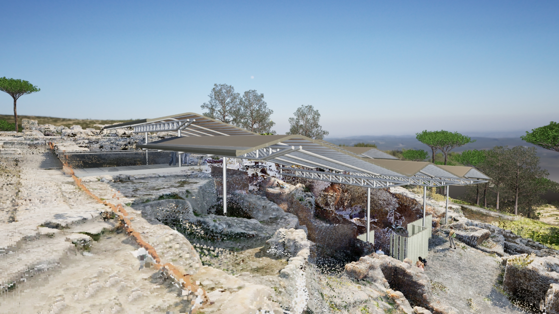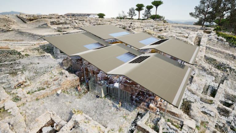 Τα υφιστάμενα στέγαστρα κατασκευάστηκαν τη δεκαετία του ΄60, και μέχρι σήμερα προστάτευσαν επαρκώς τα εξαιρετικά ευπαθή κατάλοιπα. Δύο στέγαστρα καλύπτουν τα Βασιλικά Διαμερίσματα και τμήμα των Παλαιών Ανακτόρων, ενώ τρία μικρότερα στέγαστρα καλύπτουν το Δωμάτιο –για την προστασία των πίθων που βρίσκονται κατά χώραν- τον χώρο του Κλιβάνου -για την προστασία των ευαίσθητων πηλοκονιαμάτων, με τα οποία έχουν επιχριστεί οι επιφάνειες του-, και τον δυτικό προμαχώνα, προκειμένου να προστατευθεί ο μάρτυρας στρωματογραφίας, που σώζεται εκεί. Τα νέα στέγαστρα λαμβάνουν υπόψη την ανάγκη για πλήρη προστασία των υποκείμενων καταλοίπων, τη μείωση στο ελάχιστο της διεπαφής μεταξύ νέων δομικών στοιχείων και των αρχαίων τοίχων, την αποφυγή οριζοντίων υδροσυλλεκτών στις άκρες των στεγάστρων.