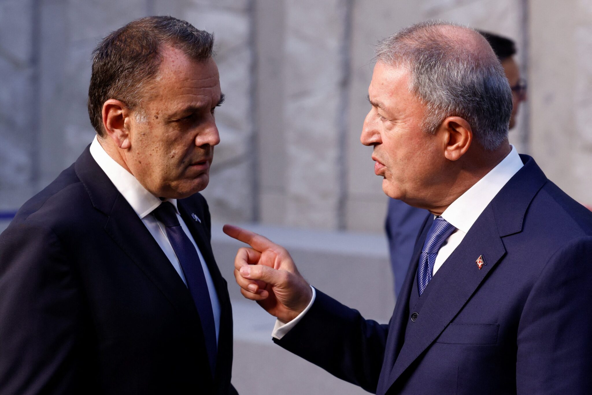 Ο υπουργός Εθνικής Aμυνας, Νίκος Παναγιωτόπουλος, συνομίλησε με τον Τούρκο ομόλογό του, Χουλουσί Ακάρ, μετά την οικογενειακή φωτογραφία στη Σύνοδο των Υπουργών Αμυνας του ΝΑΤΟ, στις Βρυξέλλες.