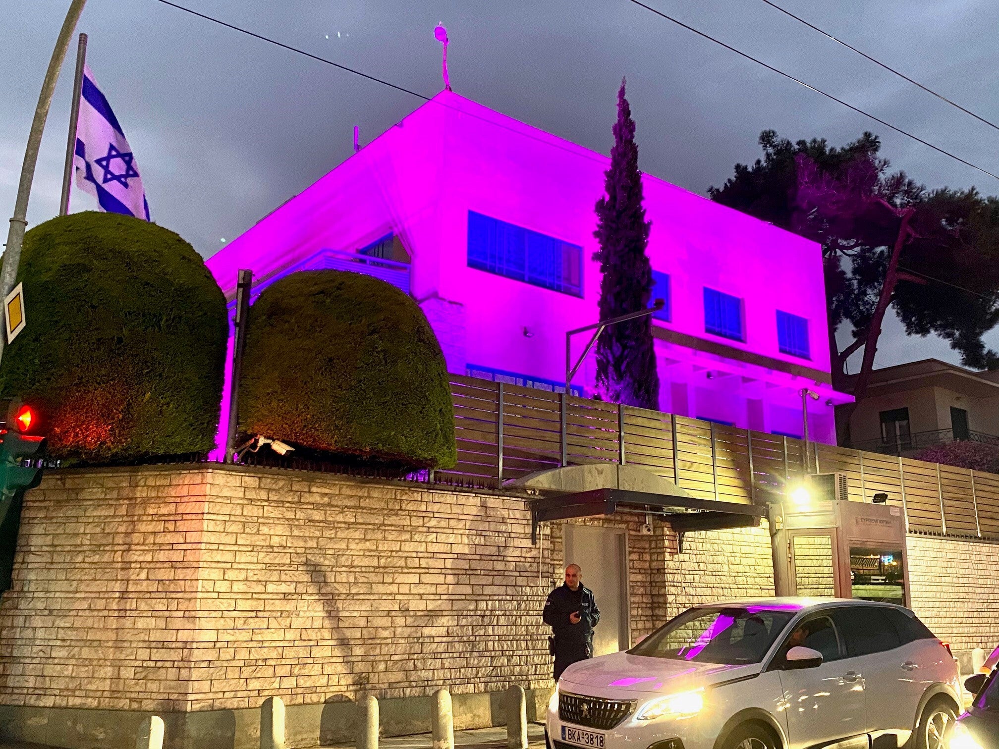 Με μωβ χρώμα φωταγωγήθηκε σήμερα η Πρεσβεία του Ισραήλ στην Αθήνα και για τις επόμενες δύο ημέρες με αφορμή την Παγκόσμια Ημέρα Ατόμων με Αναπηρία στις 3 Δεκεμβρίου.