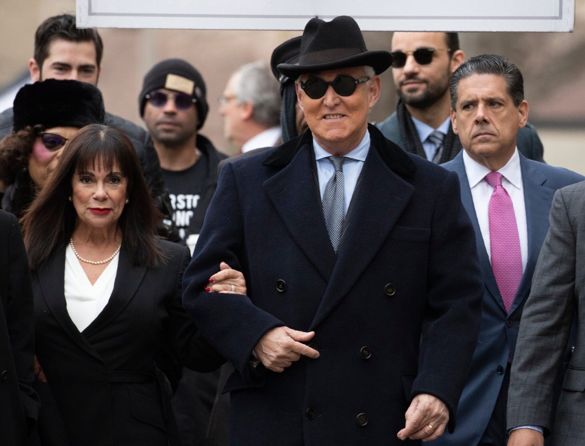 Νωρίτερα, ο Στόουν έφτασε στο δικαστήριο φορώντας γυαλιά ηλίου και καπέλο, αγκαζέ με τη σύζυγό του και περιστοιχισμένος από συγγενείς, φίλους και δικηγόρους. Πέρασε, χωρίς να σταματήσει, από έναν τεράστιο, φουσκωτό αρουραίο ντυμένο Τραμπ, με κόκκινη γραβάτα και κίτρινα μαλλιά, και από ένα πλακάτ που έγραφε ότι πρέπει να του δοθεί χάρη.