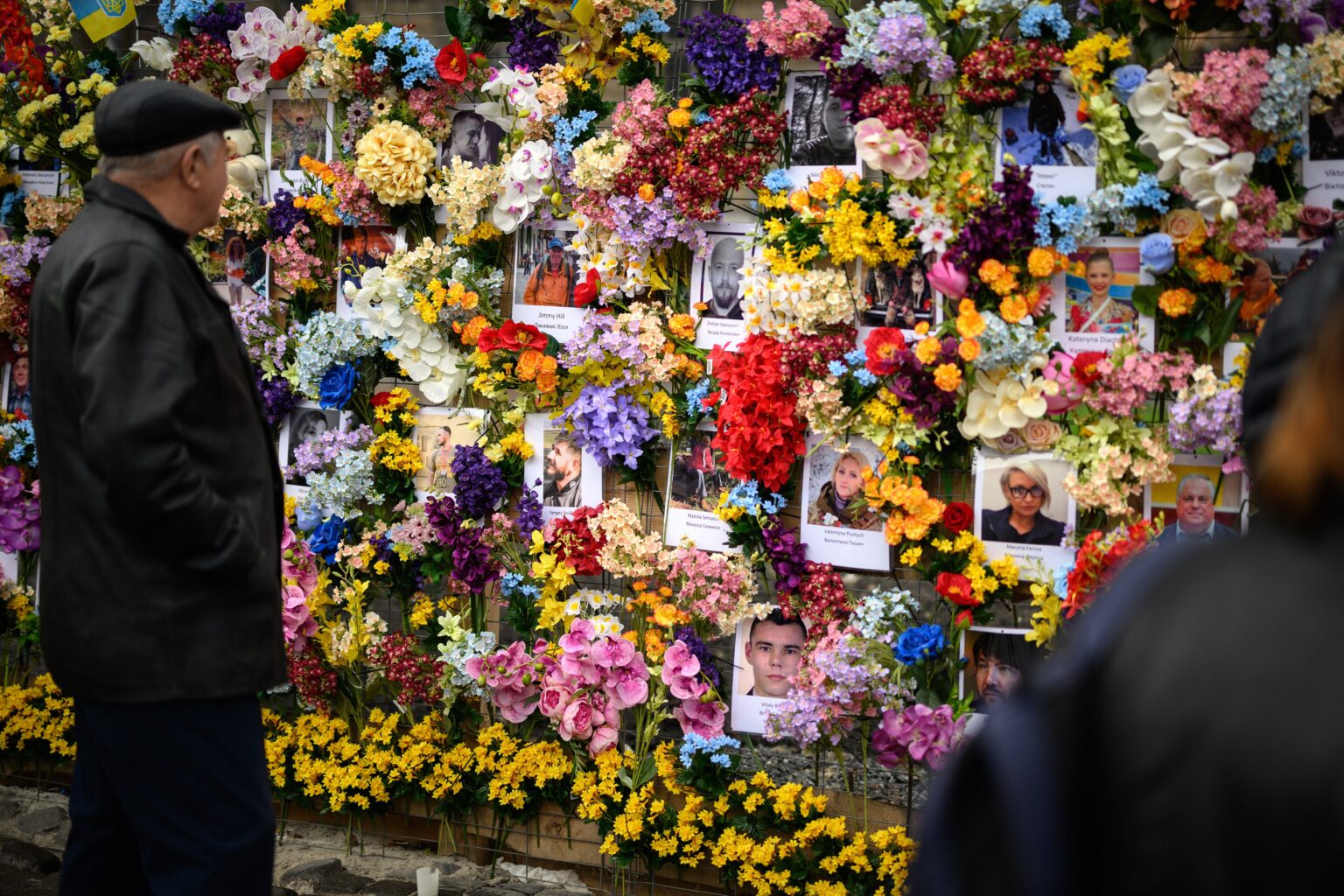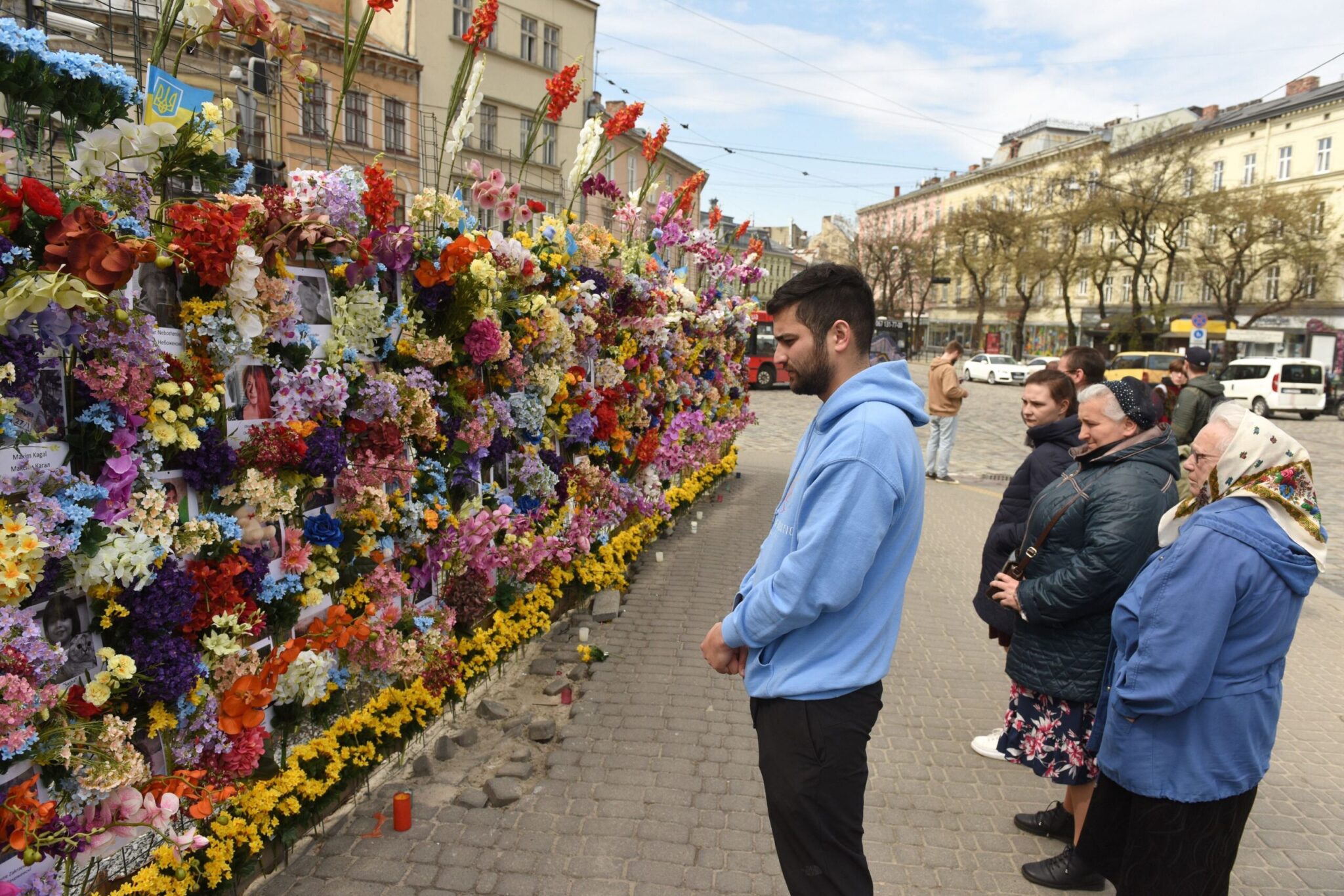 Στο Λβιβ, τη μεγαλύτερη πόλη της δυτικής Ουκρανίας, η Τετιάνα Κασιάν σταματά για μια στιγμή στον δρόμο. Απέναντί της, ένας τοίχος από τεχνητά λουλούδια και φωτογραφίες με χαμογελαστά πρόσωπα: είναι οι άνθρωποι που σκοτώθηκαν από την αρχή της ρωσικής εισβολής, πριν από δύο μήνες.