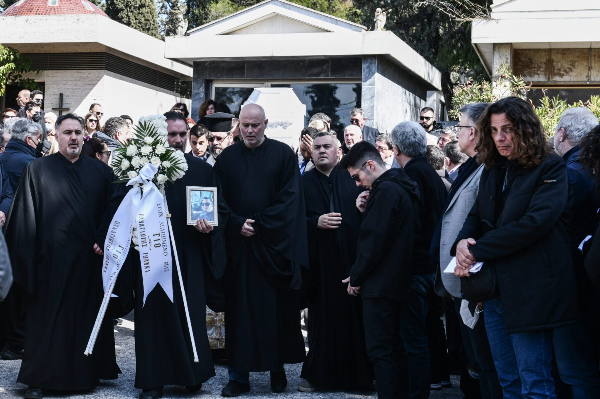 Γονείς, συγγενείς και φίλοι, λένε «αντίο» στον άτυχο νέο, κρατώντας λευκά τριαντάφυλλα στα χέρια.