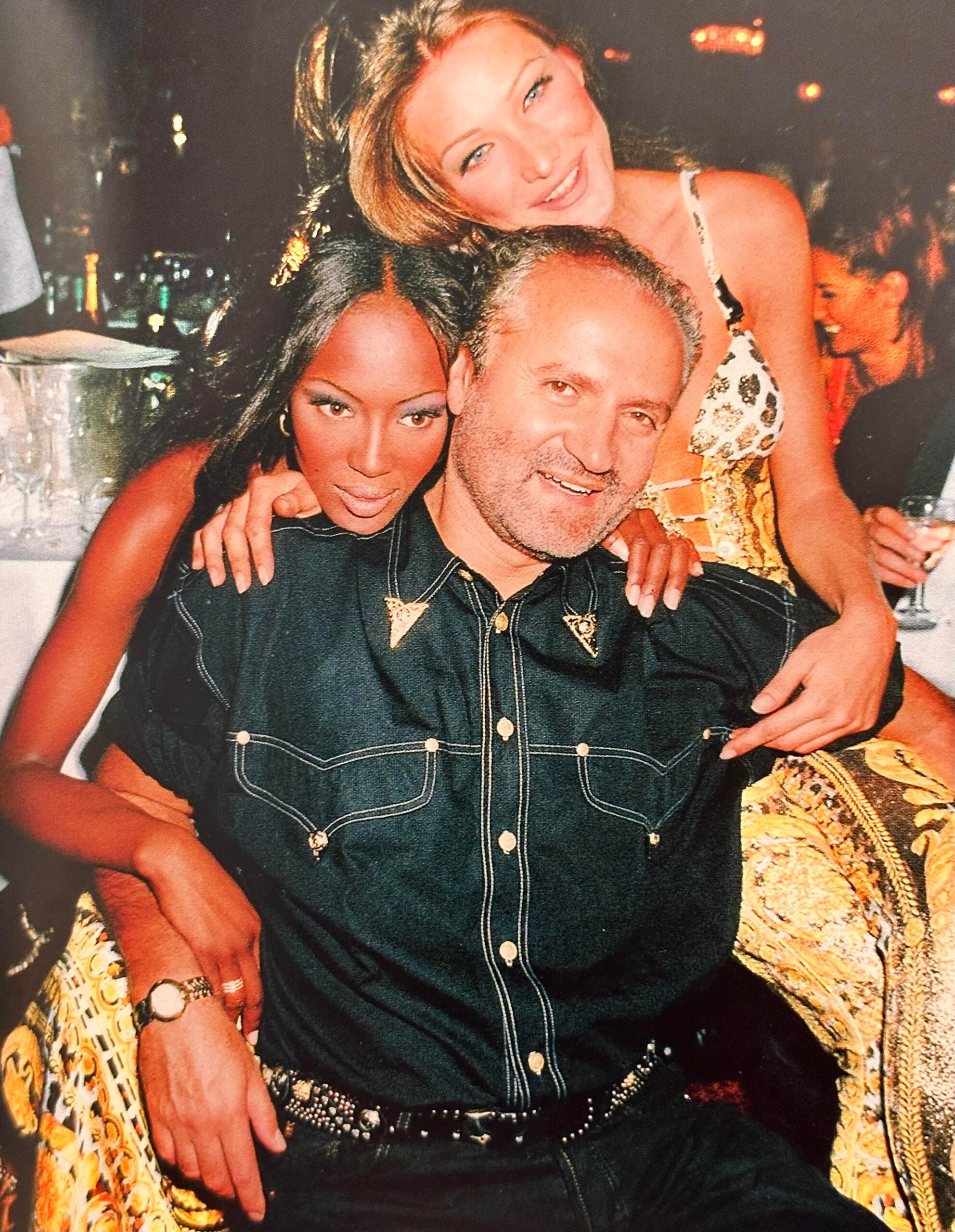 Ναόμι Κάμπελ και Κάρλα Μπρούνι φοράνε δημιουργίες Βερσάτσε με μπαρόκ πριντ και αγκαλιάζουν τον σχεδιαστή εκδόσεις Ψυχογιός