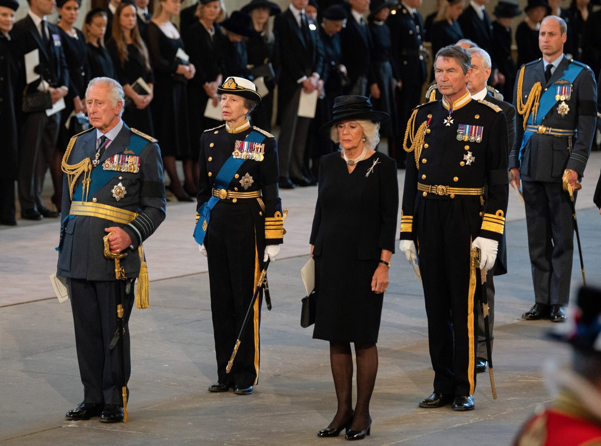 ΛΟΝΔΙΝΟ, ΑΓΓΛΙΑ – 14 ΣΕΠΤΕΜΒΡΙΟΥ: Ο βασιλιάς Κάρολος Γ’ της Αγγλίας, η Πριγκίπισσα Άννα, η Καμίλα, η Βασιλική Σύζυγος, ο Αντιναύαρχος Σερ Τίμοθι Λόρενς, ο Πρίγκιπας Άντριου, Δούκας της Υόρκης και ο Πρίγκιπας Γουίλιαμ, Πρίγκιπας της Ουαλίας αποδίδουν τα σέβη τους στο Παλάτι του Γουέστμινστερ κατά τη διάρκεια της πομπής για το λαϊκό προσκύνημα της βασίλισσας Ελισάβετ II στις 14 Σεπτεμβρίου 2022 στο Λονδίνο, Αγγλία. POOL New via Reuters