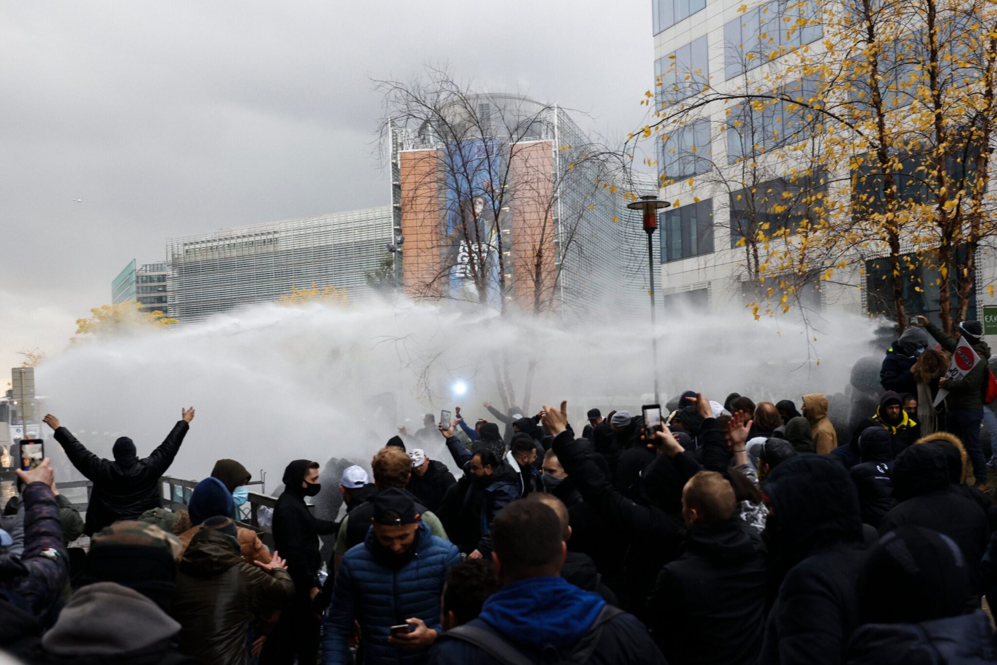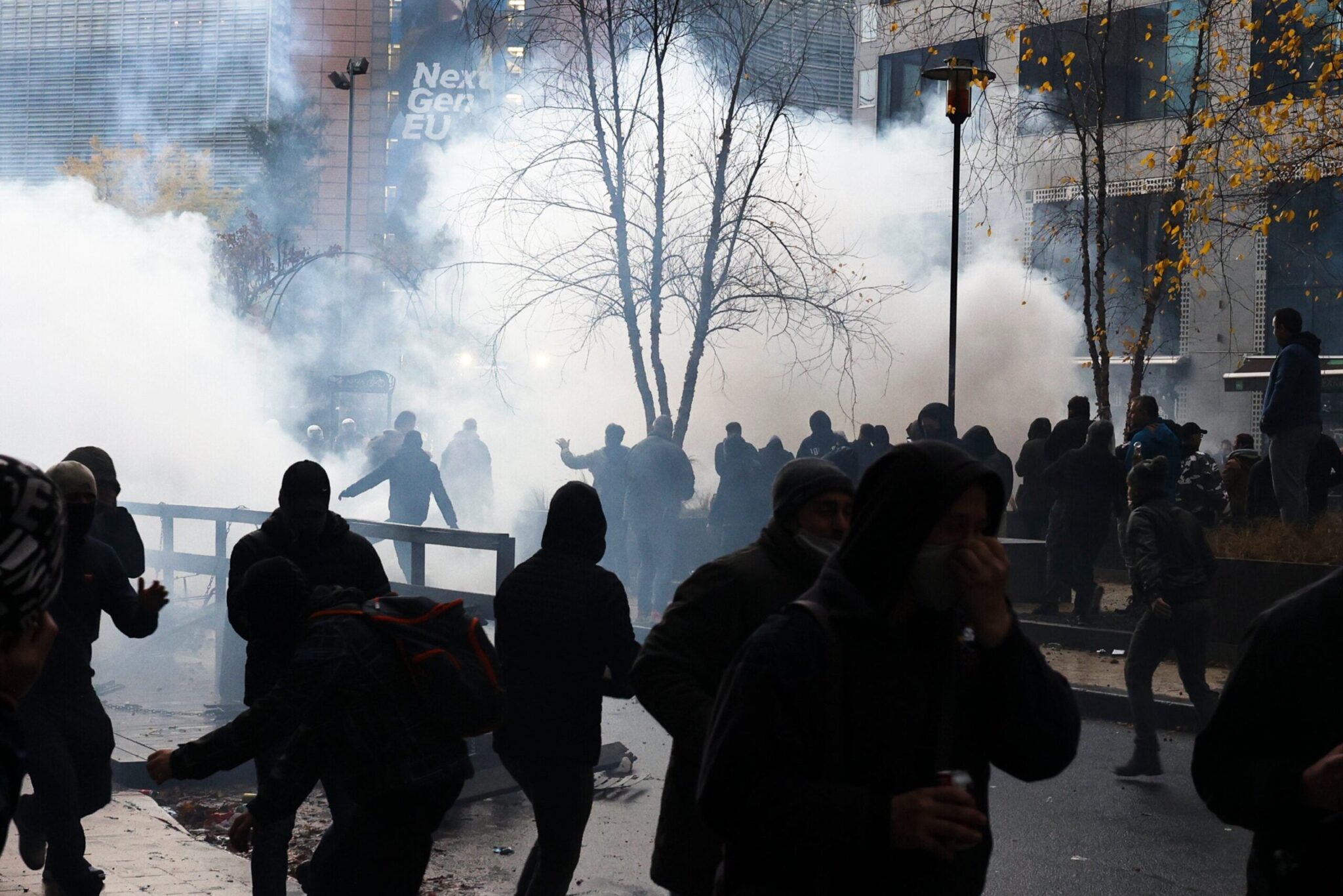 Η αστυνομία εκτιμά πως περίπου 35.000 στη διαδήλωση είχαν ήδη φύγει για τα σπίτια τους όταν ξέσπασαν τα βίαια επεισόδια, με εκατοντάδες άτομα να αρχίζουν να πετάνε αντικείμενα κατά της αστυνομίας, να σπάνε αυτοκίνητα και να βάζουν φωτιές σε κάδους απορριμμάτων. Η αστυνομία απάντησε με δακρυγόνα και κανόνια νερού, προσπαθώντας να αποκαταστήσει την τάξη ενώ νύχτωνε στην πρωτεύουσα του Βελγίου.