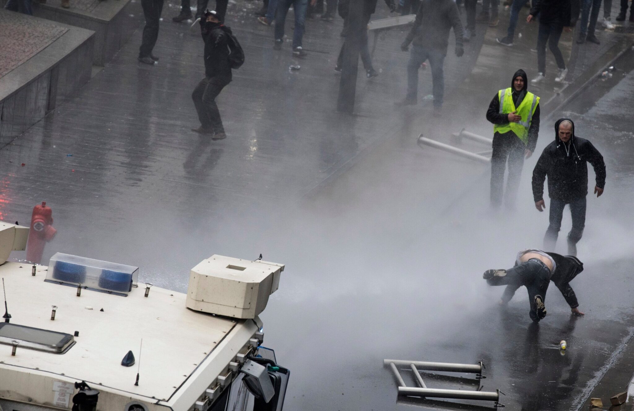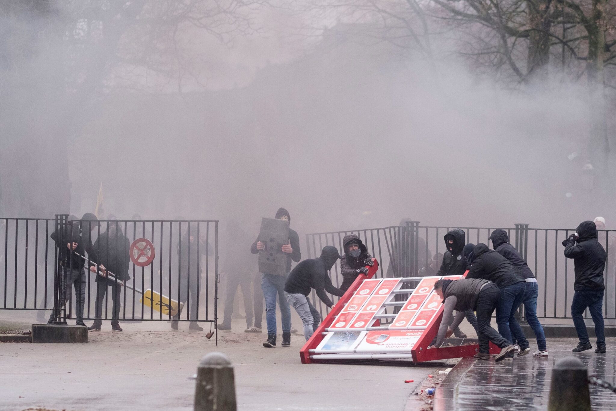 Η συγκέντρωση ξεκίνησε ήρεμα, αλλά αργότερα χρειάσθηκε η επέμβαση της αστυνομίας όταν οι διαδηλωτές πέταξαν αντικείμενα κατά των δυνάμεων ασφαλείας και βανδάλισαν τις προσόψεις κτιρίων της Ευρωπαϊκής Ενωσης. Η αστυνομία απάντησε κάνοντας χρήση δρακρυγόνων και αντλιών νερού.