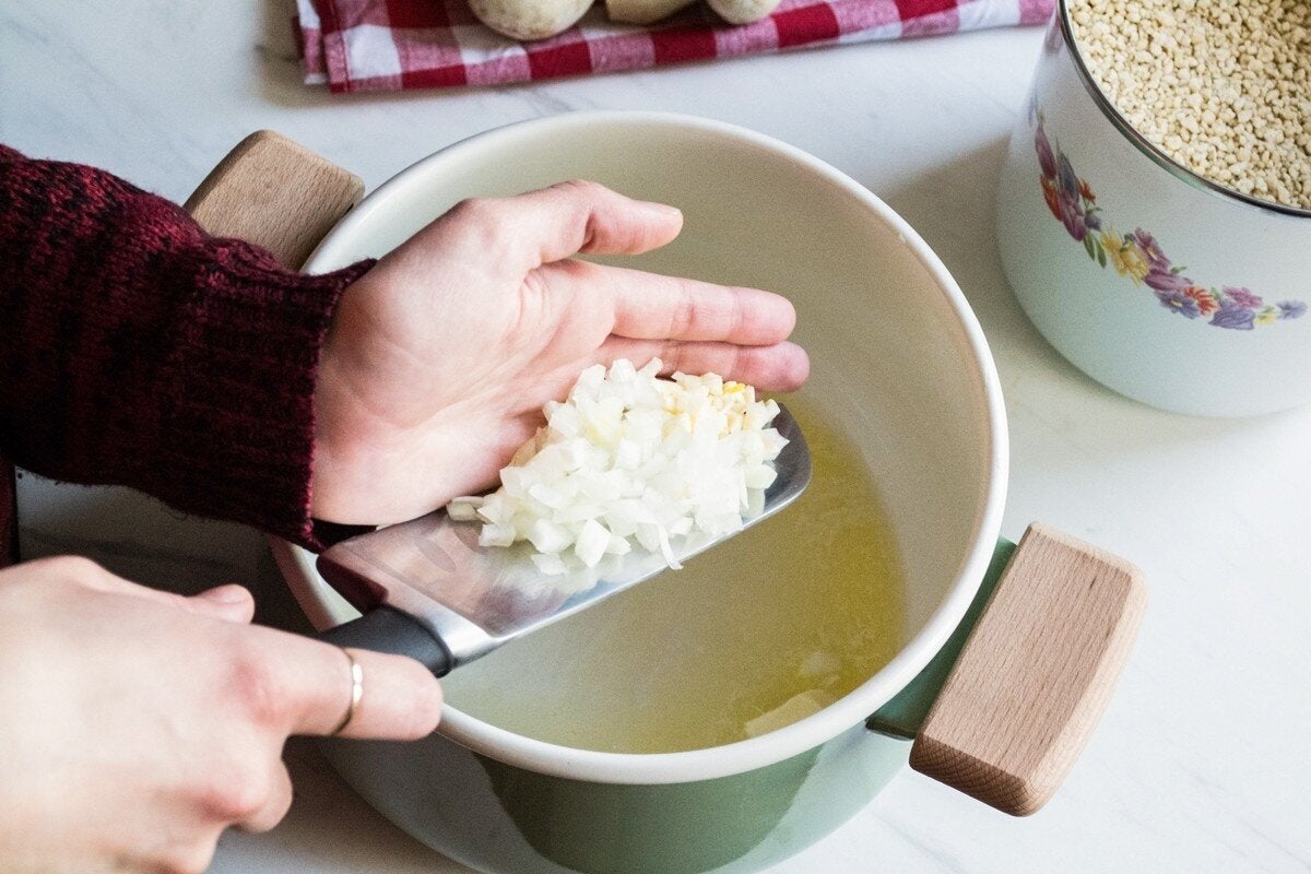 Ψιλοκόβουμε το κρεμμύδια το σωτάρουμε με το βούτυρο για 1 λεπτό, προσθέτουμε τον τραχανά και ανακατεύουμε.