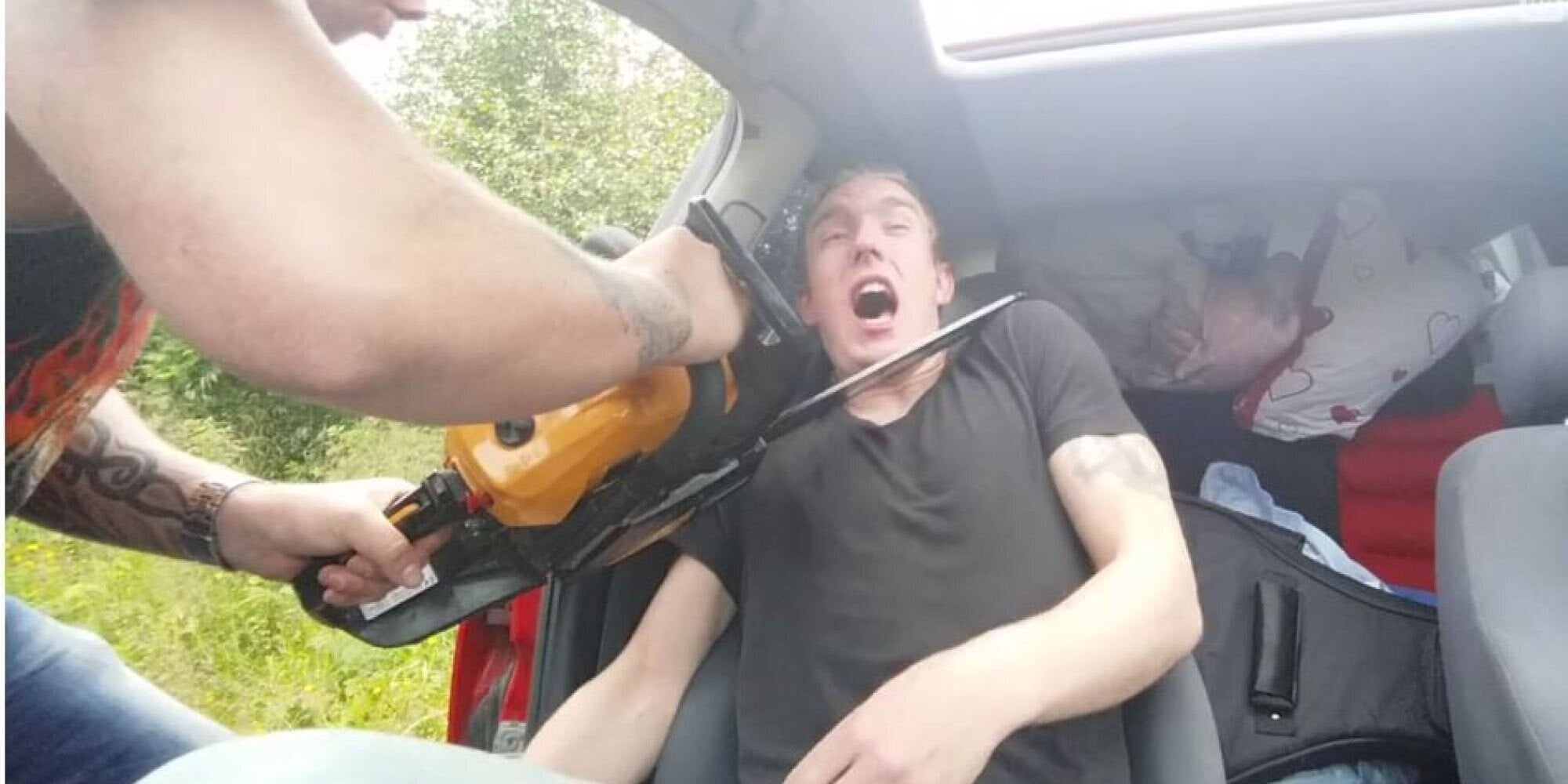 Κάποια στιγμή σταμάτησαν στην άκρη του δρόμου για να ξεκουραστούν. Όταν ο Marius αποκοιμήθηκε στη θέση του συνοδηγού ο φίλος του είχε την ιδέα να του κάνει μια φάρσα με το αλυσοπρίονο που είχε στο πορτ μπαγκάζ.
