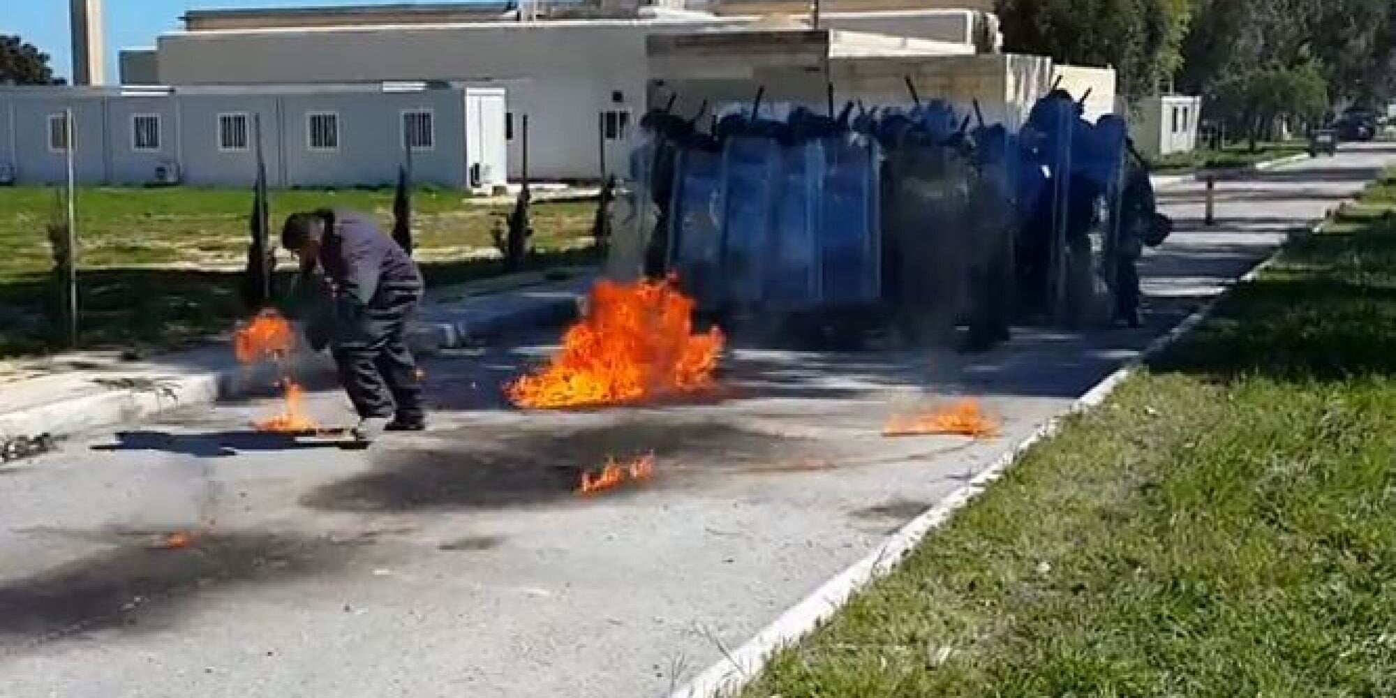 Ένας άνδρας κρατώντας μια βόμβα μολότοφ προσπαθεί να την πετάξει προς μια ομάδα παραπεταγμένων αστυνομικών οι οποίοι κρατούν γκλομπ και ασπίδες, στους στρατώνες του Safi στη Μάλτα.