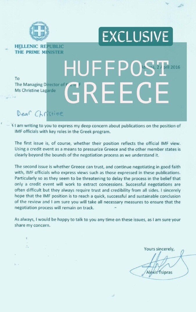 Το περιεχόμενο της επιστολής του πρωθυπουργού Αλέξη Τσίπρα προς την επικεφαλής του ΔΝΤ, Κριστίν Λαγκάρντ αποκαλύπτει η HuffPost Greece. Πρόκειται για την επιστολή την οποία απέστειλε ο πρωθυπουργός στην επικεφαλής του ΔΝΤ αναφορικά με όσα είδαν το φως της δημοσιότητας έπειτα και τις αποκαλύψεις του Wikileaks.