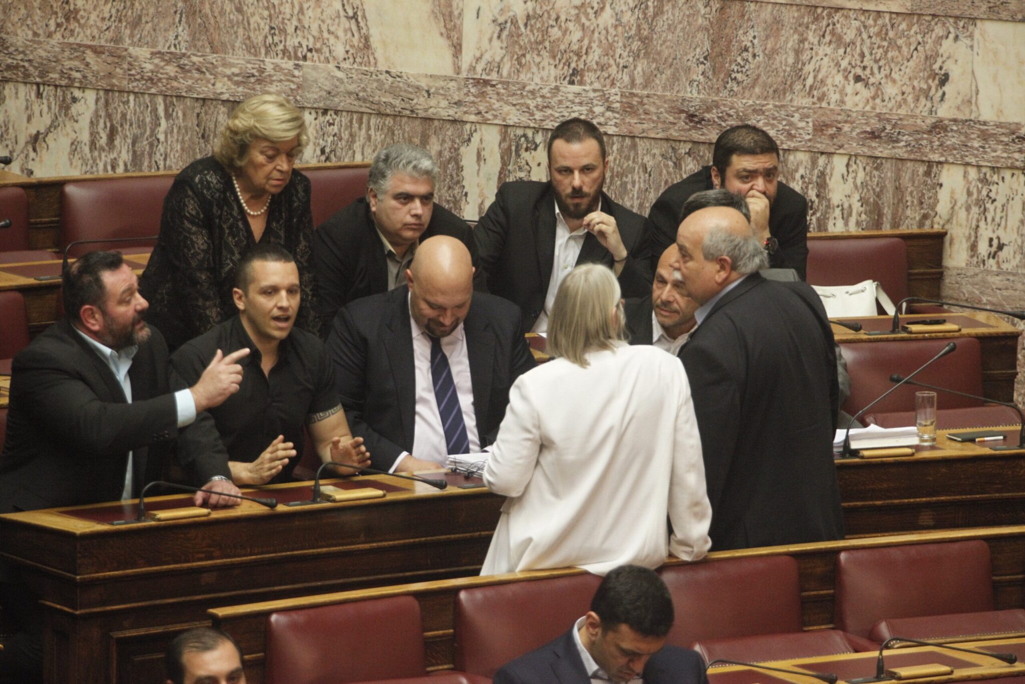 Παρά την παρέμβαση του προέδρου της Βουλής Νίκου Βούτση να αποχωρήσει ο κ. Λαγός από την αίθουσα ώστε να επαναληφθεί η συζήτηση, η κοινοβουλευτική ομάδα της Χρυσής Αυγής αρνήθηκε να αποχωρήσει ο βουλευτής της. Μάλιστα βουλευτές της ΧΑ σχημάτισαν «ασπίδα» γύρω από τον κ. Λαγό και δεν επέτρεψαν να απομακρυνθεί.