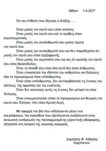 Τη δήλωση του Δημήτρη Λάζαρη, του πατέρα του άτυχου 24χρονου φοιτητή που χτυπήθηκε την Παρασκευή κοντά στη λεωφόρο από τάγμα ακροδεξιών Κατεχάκη στην Αθήνα, δημοσιεύει το bloko.gr.