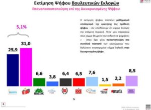 Συγκεκριμένα σε ό,τι αφορά την πρόθεση ψήφου για τις εθνικές εκλογές ο ΣΥΡΙΖΑ συγκεντρώνει 27,5% (27% στην προηγούμενη δημοσκόπηση) και η ΝΔ 24% (22%). Τρίτο κόμμα εμφανίζεται το Ελια-ΠΑΣΟΚ με 7% (6,5%). Ακολουθούν η Χρυσή Αυγή με 6% (6%), «Το Ποτάμι» με 5,5% (6%), το ΚΚΕ με 5% (5,5%) και οι Ανεξάρτητοι Έλληνες με 3,5% (3,5%). «’Αλλο κόμμα» επιλέγει το 6% (6%) των ερωτηθέντων. Το Λευκό/’Ακυρο/Αποχή εμφανίζει ποσοστό 7,5% (8%), ενώ 8% (9,5%) του δείγματος δήλωσαν αναποφάσιστοι ή δεν απάντησαν.