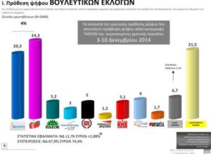 Τα αντίστοιχα ποσοστά της εκτίμησης ψήφου των βουλευτικών εκλογών όπως καταγράφονται στην τηλεφωνική έρευνα με αφορμή τις τρέχουσες πολιτικές εξελίξεις (10-13/12) διαμορφώθηκαν ως εξής: ΣΥΡΙΖΑ 30,8%, Ν.Δ. 26,7%, «Το Ποτάμι» 7,3%, ΠΑΣΟΚ 7,0%, ΚΚΕ 6,4%, Ανεξάρτητοι Έλληνες 3,6% ΑΝΤΑΡΣΥΑ 2,3%, ΔΗΜΑΡ 1,9% και «Άλλο Κόμμα» 8,3%.