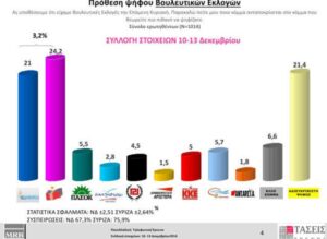 Τα αντίστοιχα ποσοστά της πρόθεσης ψήφου με αφορμή τις τρέχουσες πολιτικές εξελίξεις, όπως προέκυψαν από την τηλεφωνική έρευνα (10-13/12) που διενεργήθηκε, δίνουν διαφορά ανάμεσα στα δύο κόμματα της τάξης του 3,2%. Συγκεκριμένα ο ΣΥΡΙΖΑ στην τηλεφωνική έρευνα συγκεντρώνει το 24,2% των ερωτηθέντων με τη ΝΔ στο 21%. Ακολουθούν: «Το Ποτάμι» με 5,7%, ΠΑΣΟΚ με 5,5%, ΚΚΕ με 5%, Χρυσή Αυγή με 4,5%, Ανεξάρτητοι Έλληνες με 2,8%, ΑΝΤΑΡΣΥΑ με 1,8% και ΔΗΜΑΡ με 1,5%. «Αλλο Κόμμα» επέλεξε στην τηλεφωνική έρευνα το 6,6% των ερωτηθέντων, ενώ το ποσοστό της «Αδιευκρίνιστης Ψήφου» αγγίζει το 21,4%.