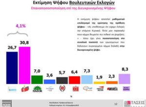 Στην πρόθεση ψήφου με αναγωγή επί των εγκύρων (χωρίς άκυρο, λευκό και αποχή) ο ΣΥΡΙΖΑ συγκεντρώνει 30% (29,5%) και η ΝΔ 26% (24%). Ακολουθούν το Ελια-ΠΑΣΟΚ με 7,5% (7%), η Χρυσή Αυγή με 6,5% (6,5%), «Το Ποτάμι» με 6% (6,5%), το ΚΚΕ με 5,5% (6%) και οι Ανεξάρτητοι Έλληνες με 3,5% (4%). «’Αλλο κόμμα» με 6,5% (6,5%) των ερωτηθέντων, ενώ 8,5% (10,5%) του δείγματος συγκεντρώνει η κατηγορία «Αναποφάσιστοι/Δεν απάντησαν».
