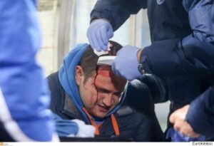 Από τα σοβαρά επεισόδια που έλαβαν χώρα στις εξέδρες του γηπέδου προκλήθηκε μάλιστα ένας σοβαρός τραυματισμός, με τον δημοσιογράφο του passports.gr Θανάση Μηριούνη να δέχεται μία πέτρα στο κεφάλι και να μεταφέρεται αιμόφυρτος εντός αγωνιστικού χώρου για να του παρασχεθούν άμεσα οι πρώτες βοήθειες (του τοποθετήθηκαν ράμματα στο κεφάλι).