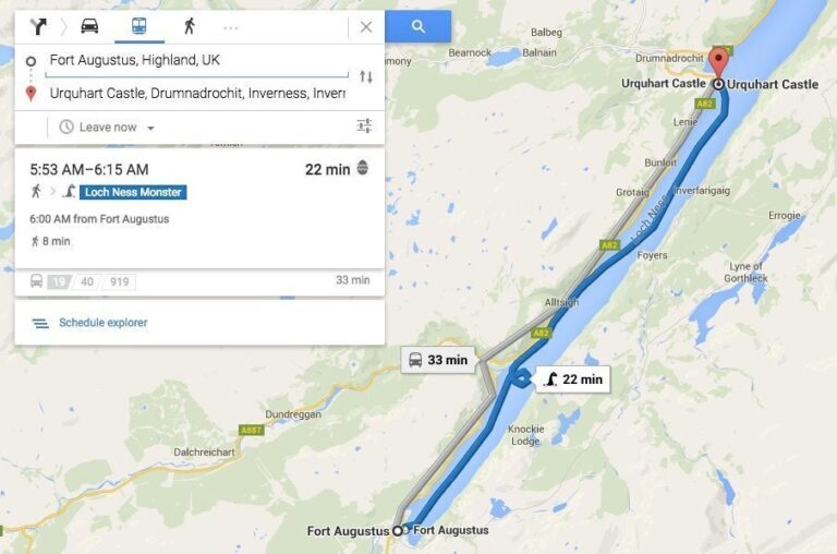 Άλλη μια…αξιοσημείωτη διαδρομή είναι το ταξίδι ανάμεσα στο Φορτ Αουγκούστους και το κάστρο Ούρκουχαρτ στα Χάιλαντς της Σκωτίας. Ο ενδιαφερόμενος μπορεί είτε να πάρει το λεωφορείο, που θα χρειαστεί 33 λεπτά, είτε το τέρας του Λοχ Νες (22 λεπτά).