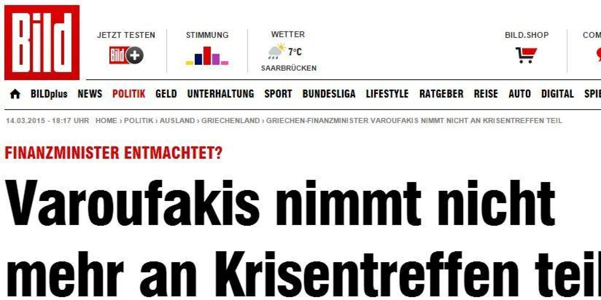 Το δημοσίευμα έχει στον τίτλο ερώτηση: «Χάνει την εξουσία ο Υπουργός Οικονομικών;». Και ορμώμενη από το γεγονός ότι ο Γ. Βαρουφάκης δεν συμμετείχε στη σύσκεψη του οικονομικού επιτελείου στο Μαξίμου, γιατί ήταν στο Κόμο, καταλήγει στο ότι ο Γ. Βαρουφάκης είναι έτοιμος να καταρρεύσει.